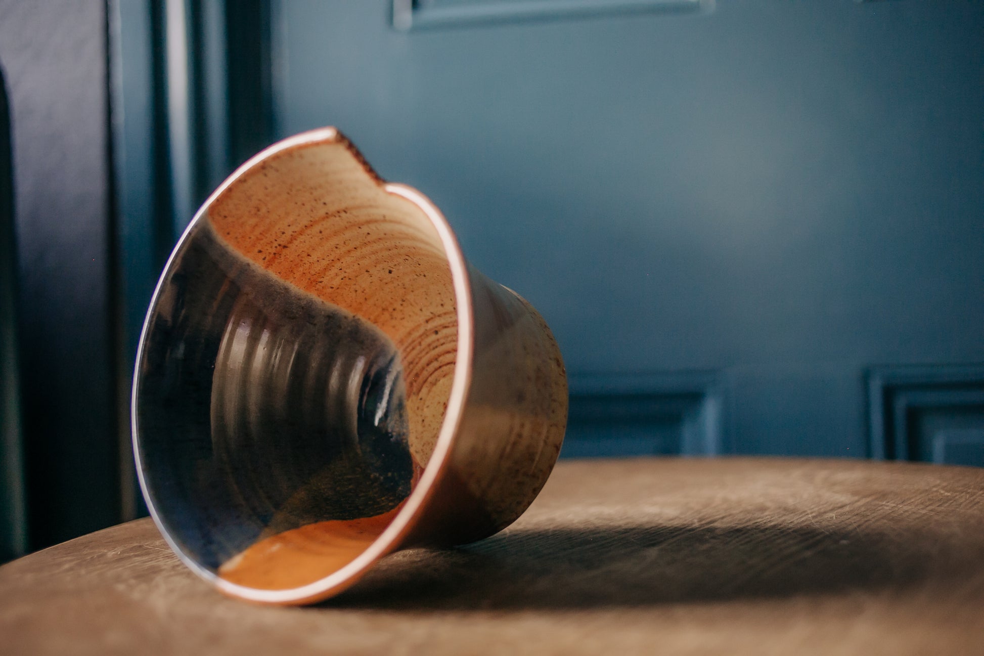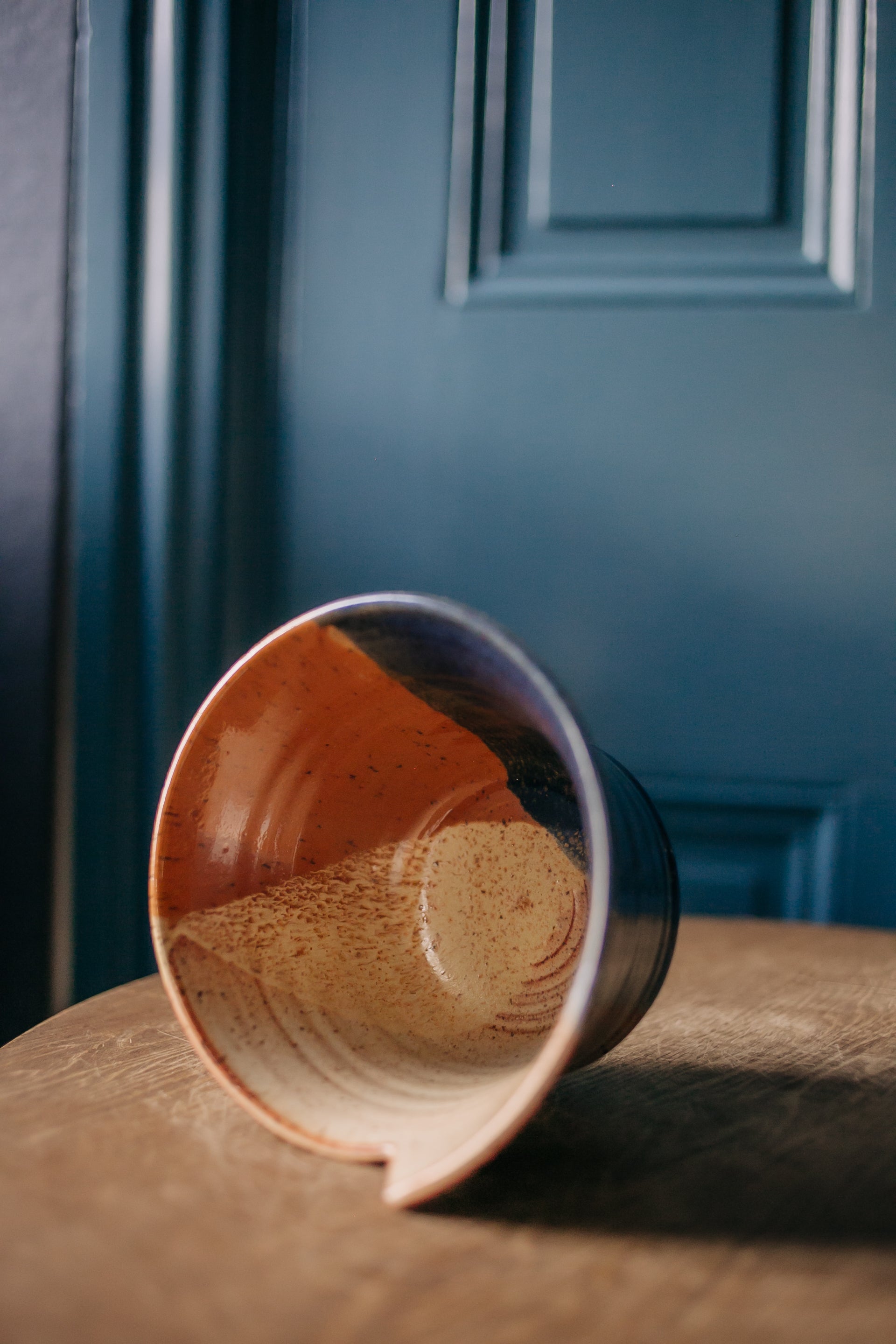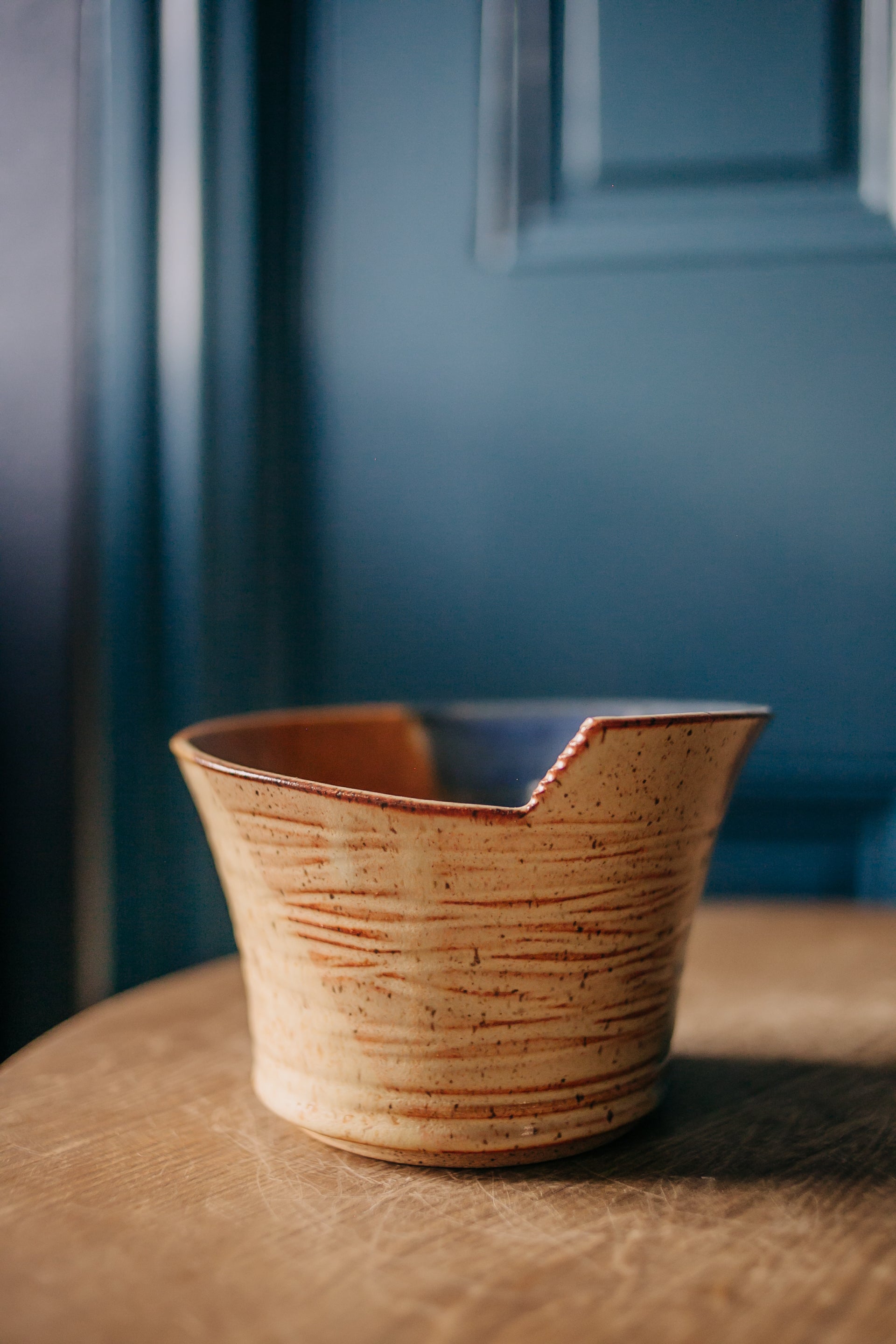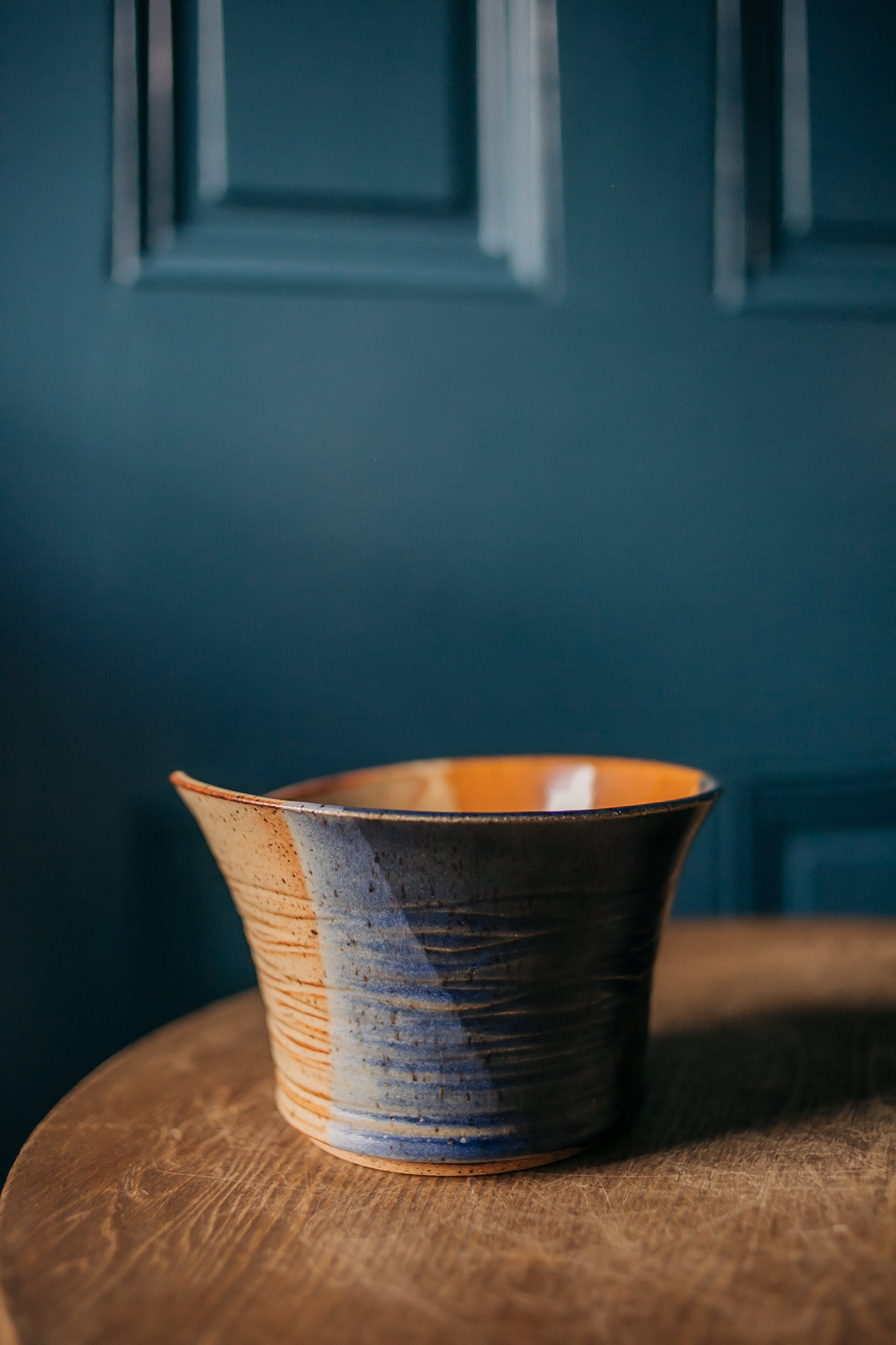 This guy was supposed to have one of those carved off swirly handles, but it snapped. Sometimes we snap, right? He's handsome nonetheless - perfectly sized, nicely glazed and ready to be totally bad ass on your table. 6" in diameter by 4" tall