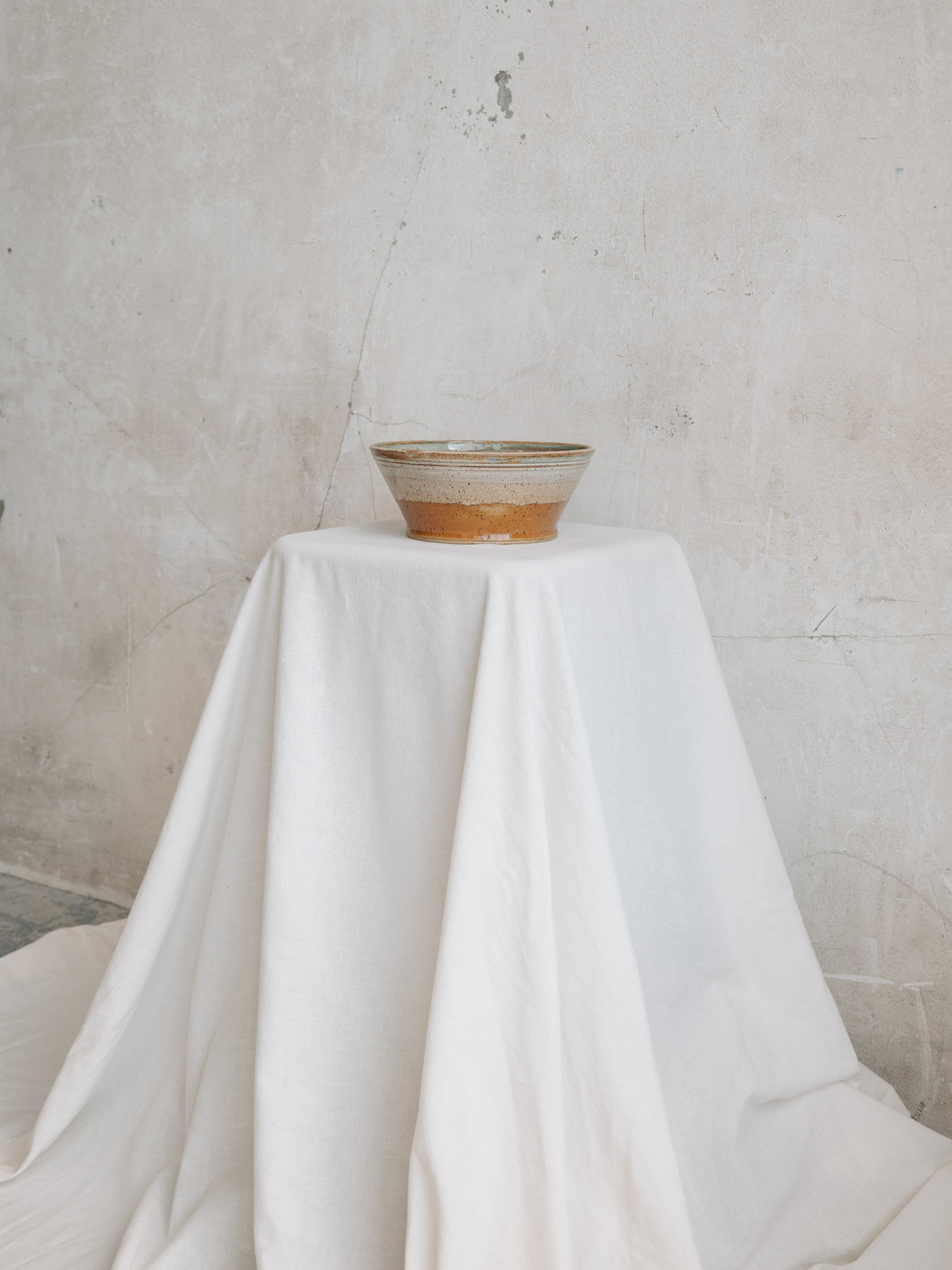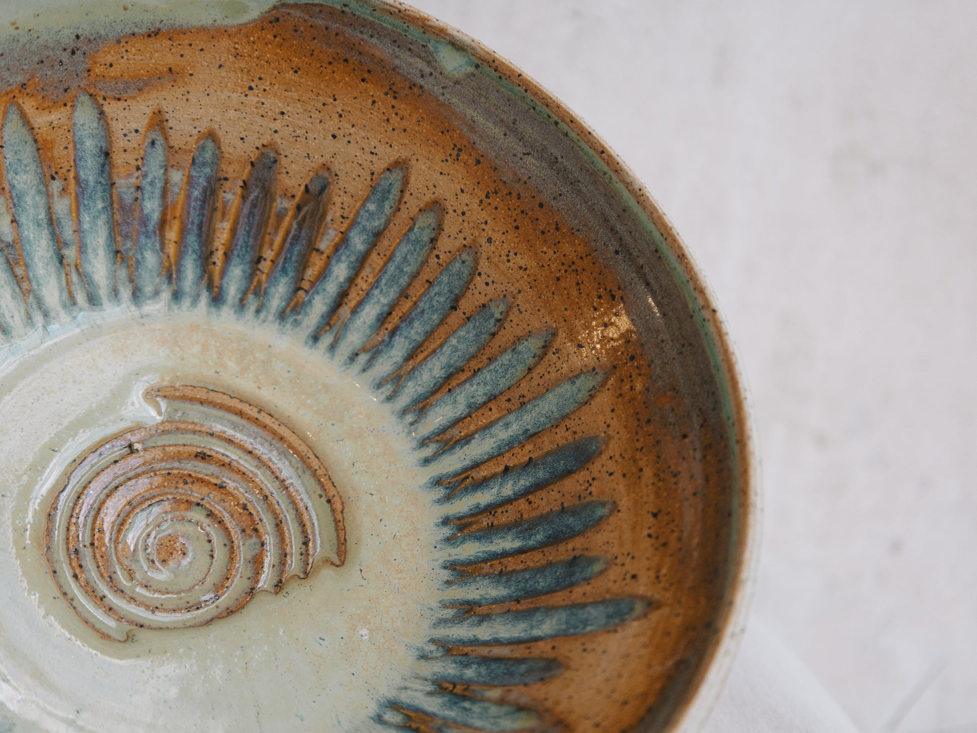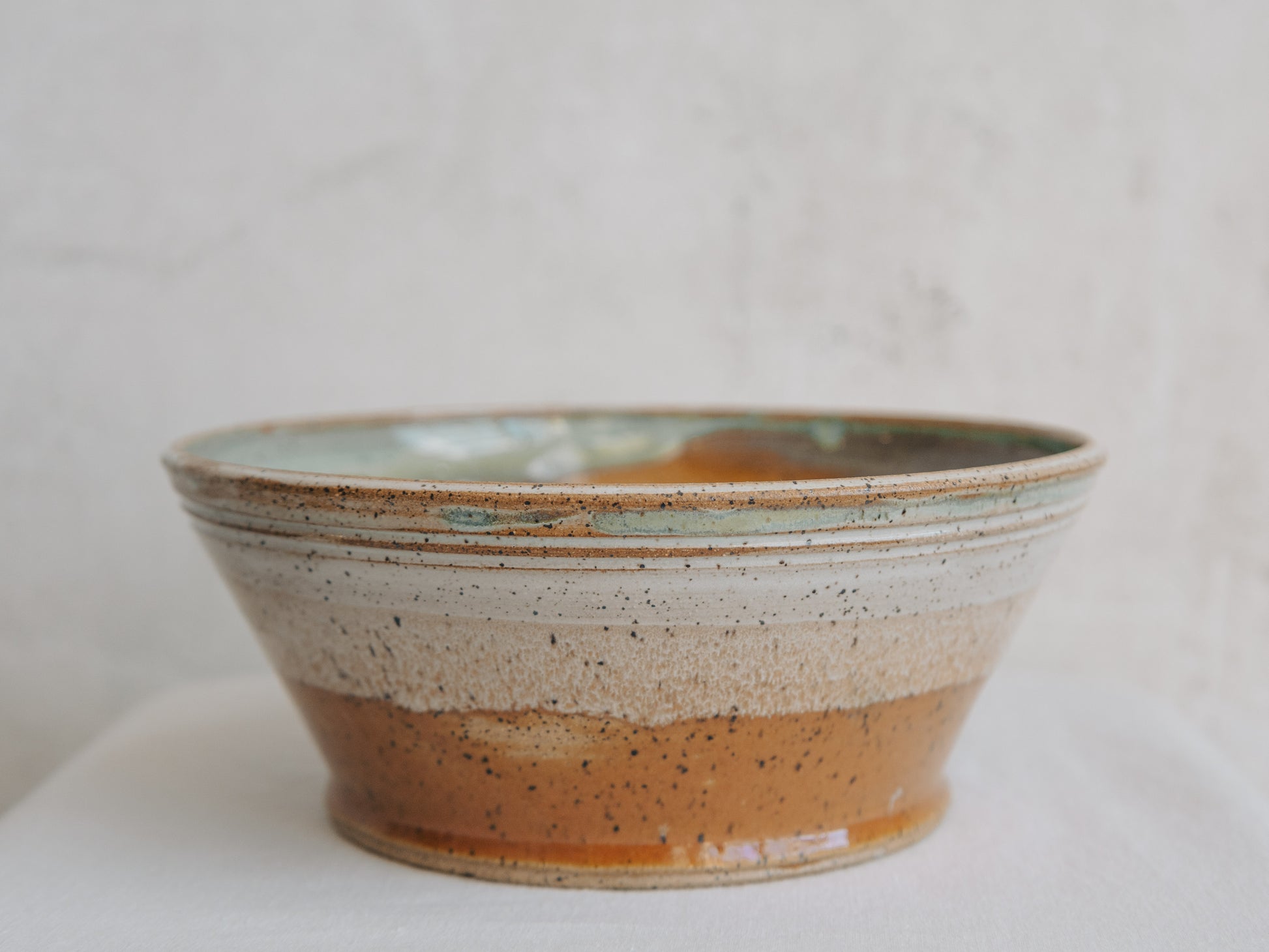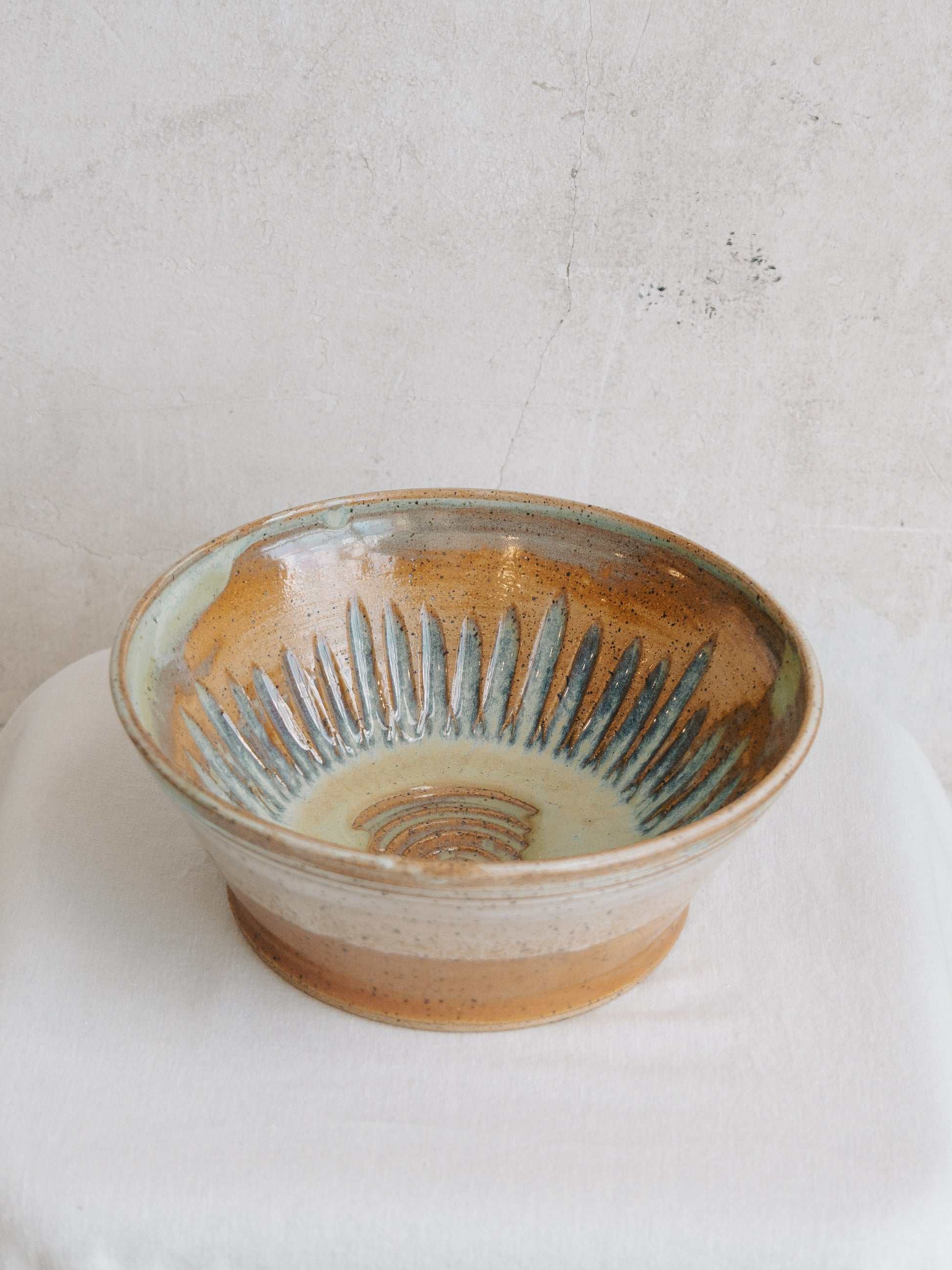 Talk about a great first impression - this guy is a stunner. The weight, the size, the textures and the color are absolutely mesmerizing. The accents of blue and cream stand out on the Pumpkin and Spearmint glazes. 8 1/2" around by 3 1/2" high