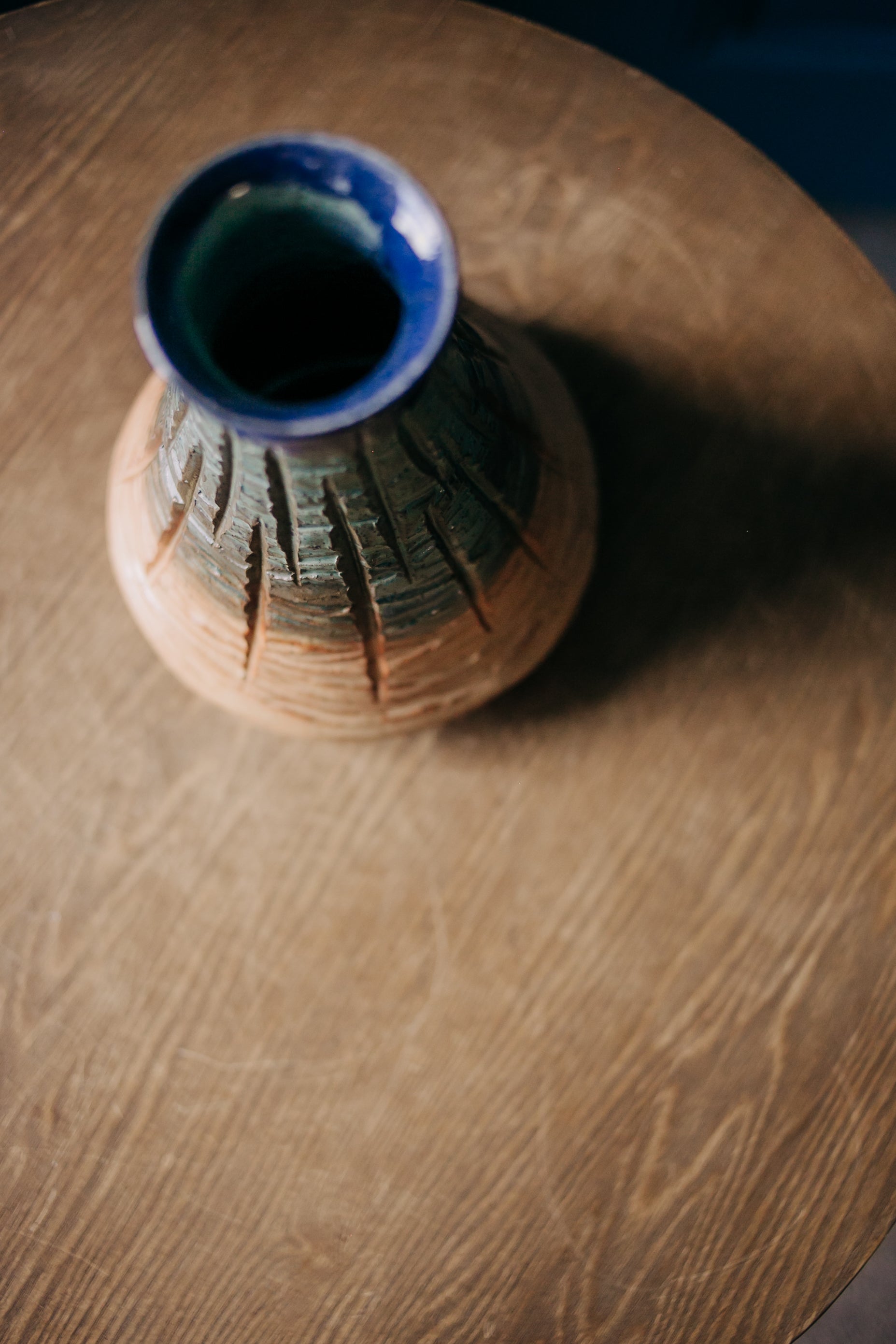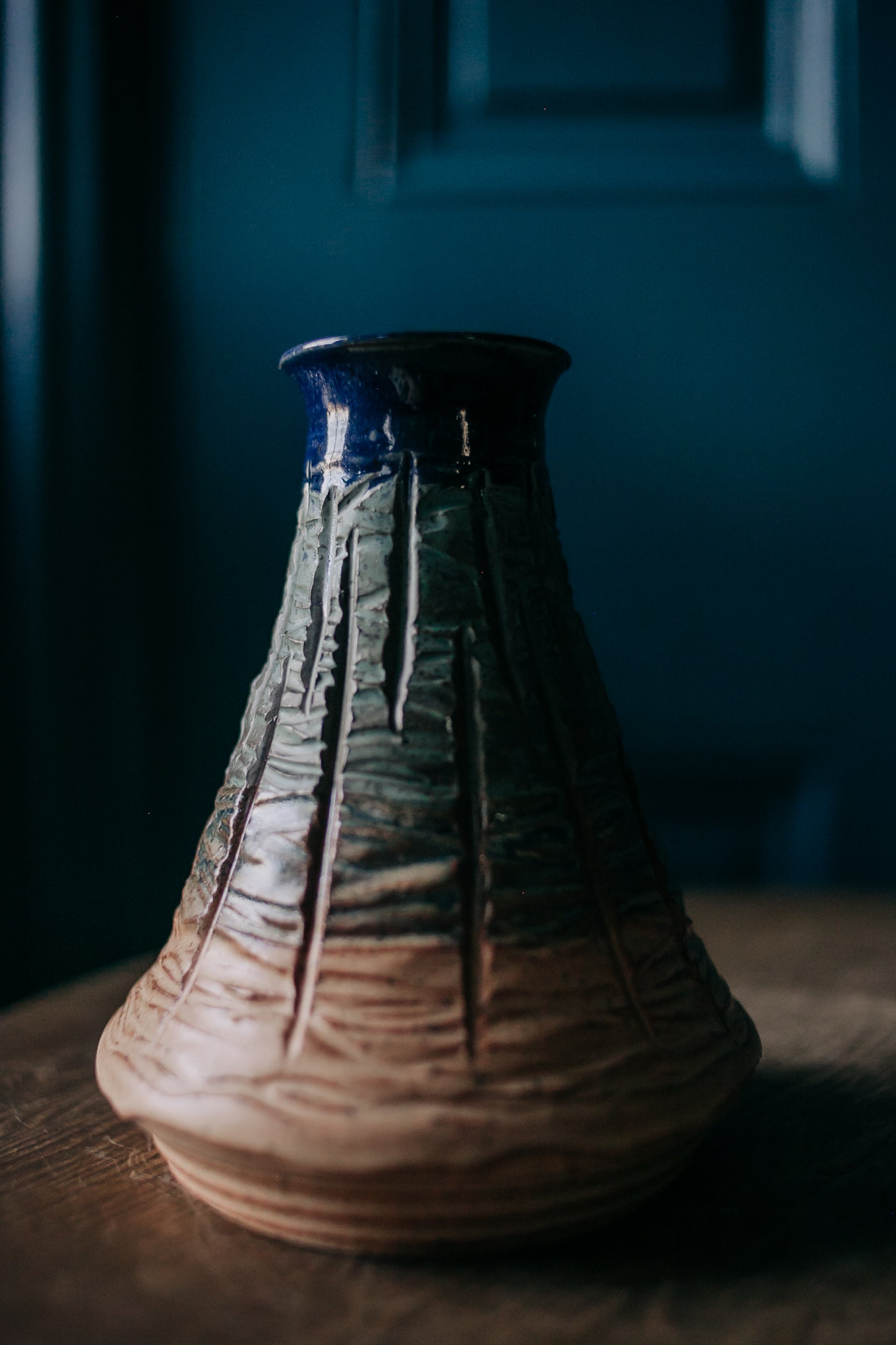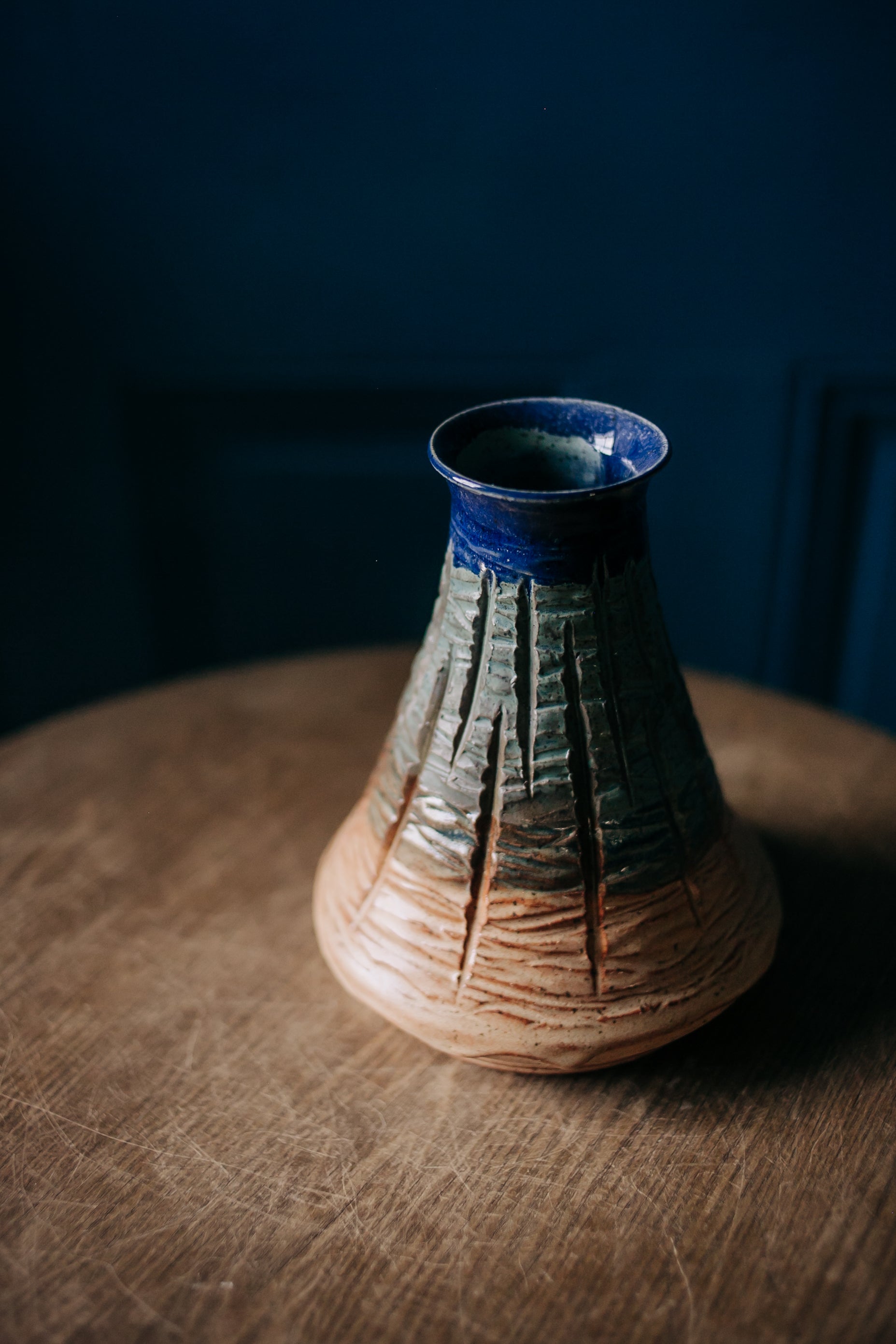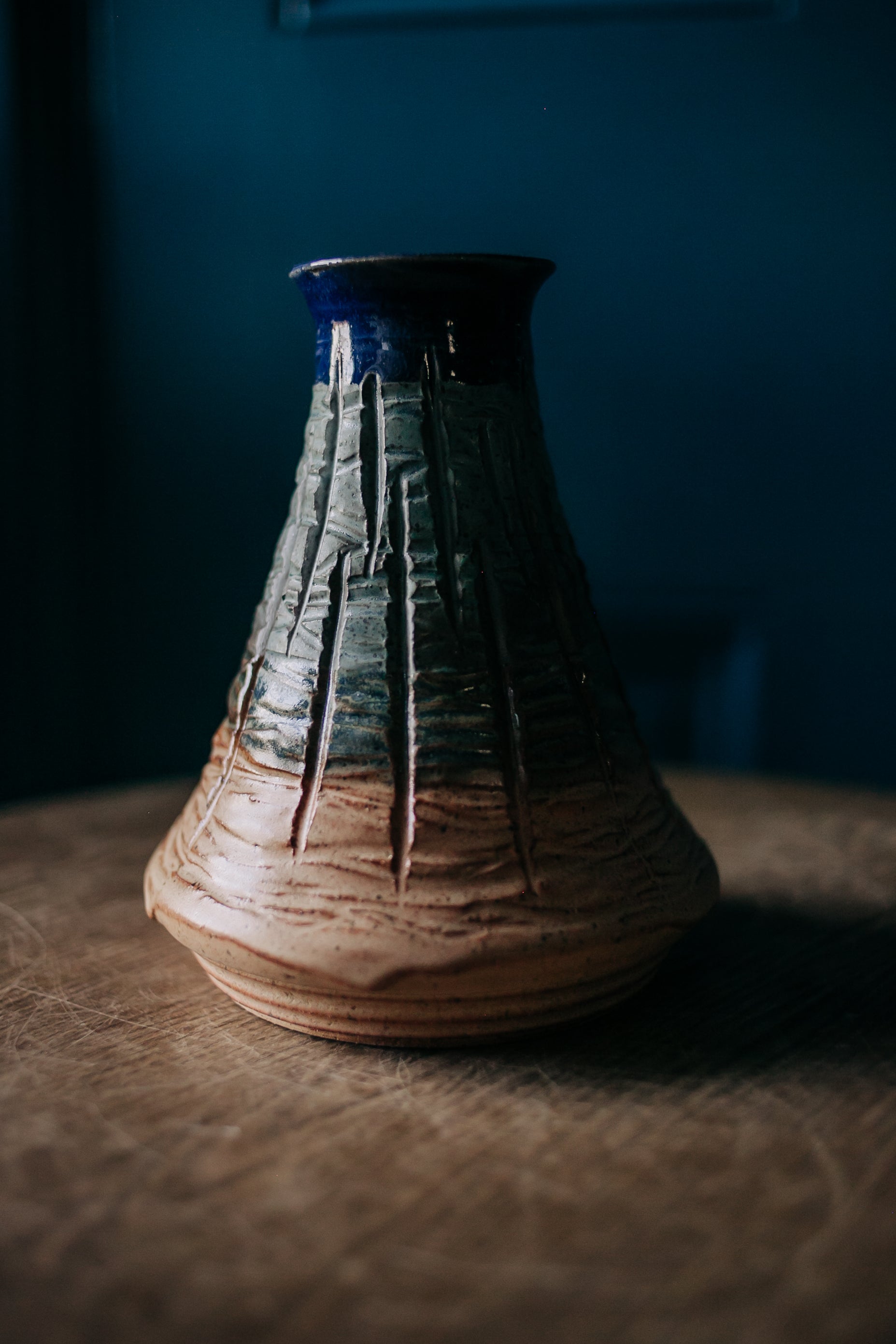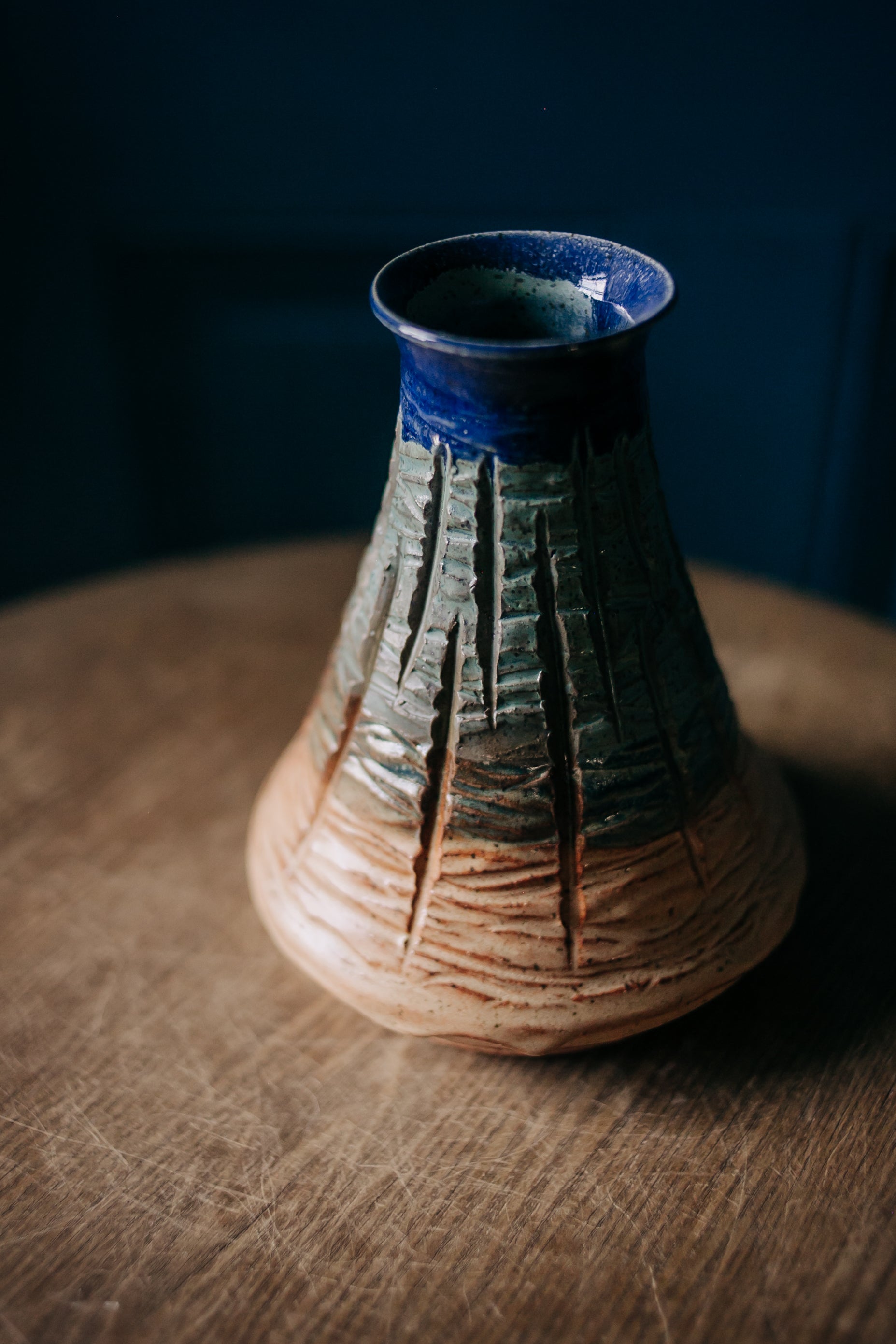 Sometimes these shapes take on a life of their own, and other times they are created to try some slip textures - this was one of those. The slip was a little too wet and it didn't quite hold up, but the "drippiness" along the bottom is kinda sexy. Add some carving and my classic palette of Blue Spruce, Navy and Nutmeg and we've got a winner!