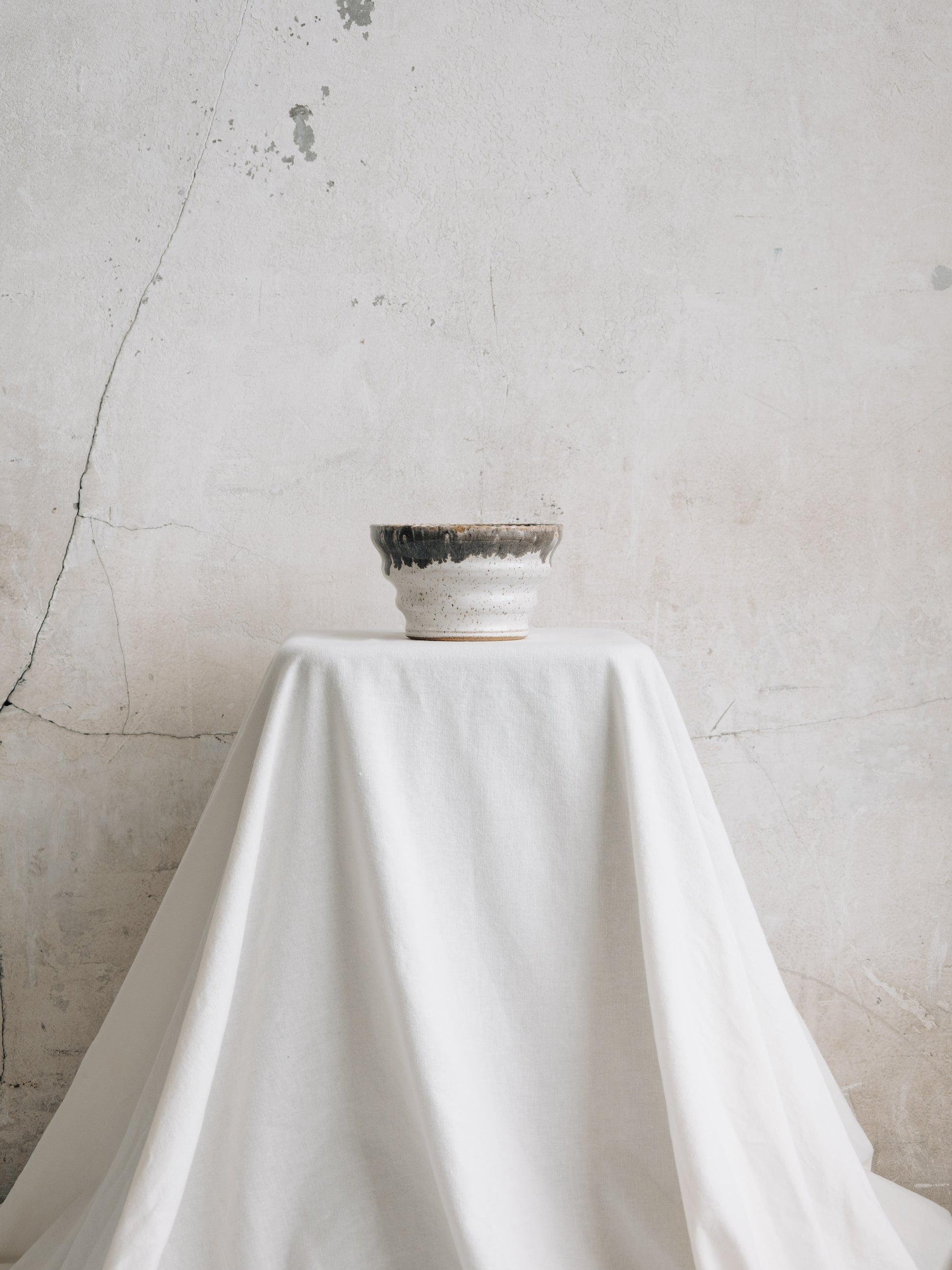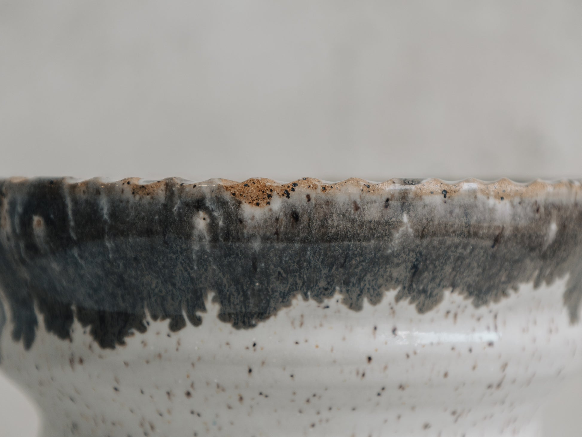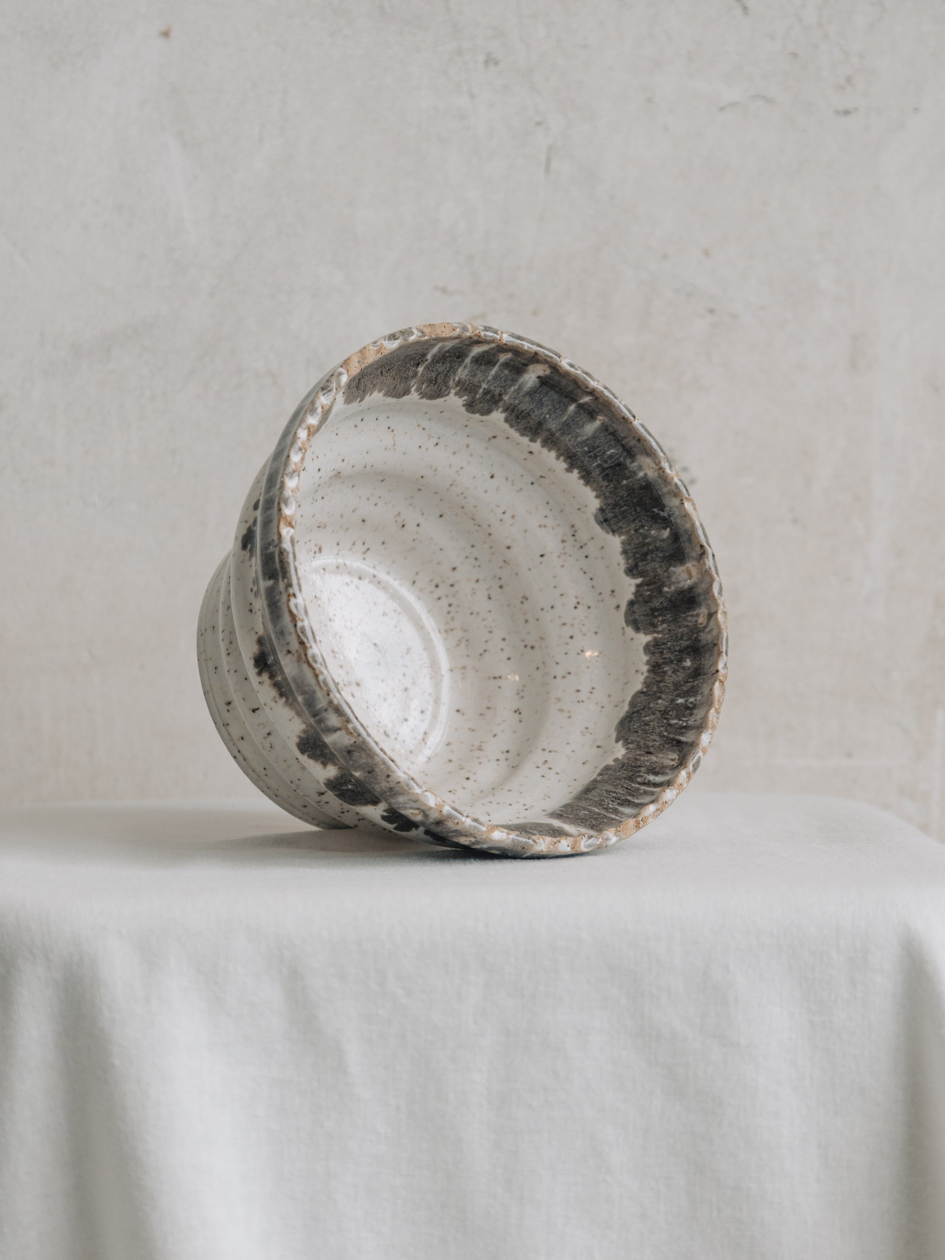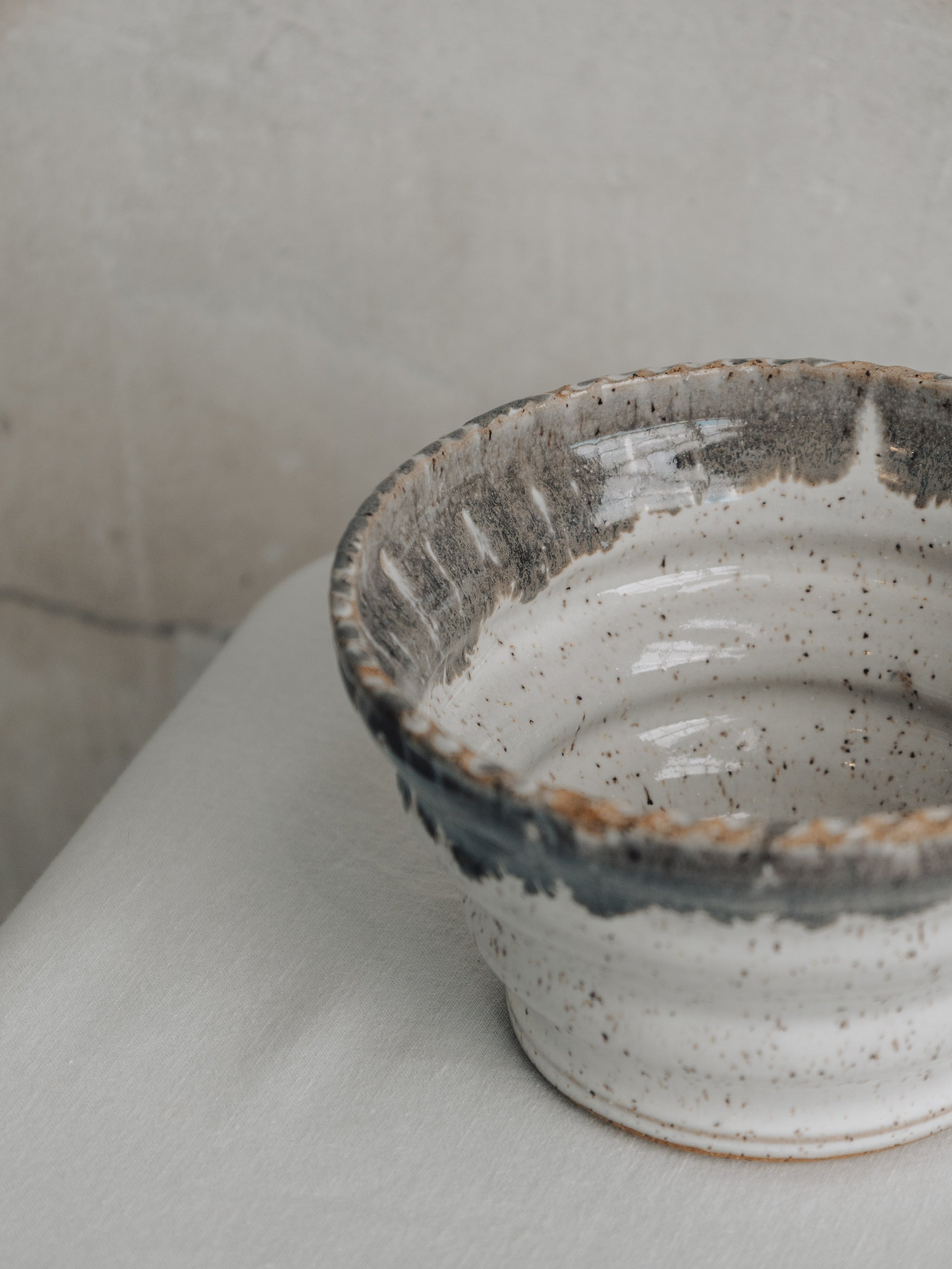 He's just a bowl, but is he JUST A BOWL? Oversized ribs on the body and a subtle rope design element on the rim. The glaze is a simple cream that shows off the specks in the clay. Cobblestone Gray on the rim bleeds out into a very organic texture. 6 1/2" in diameter by 4" high