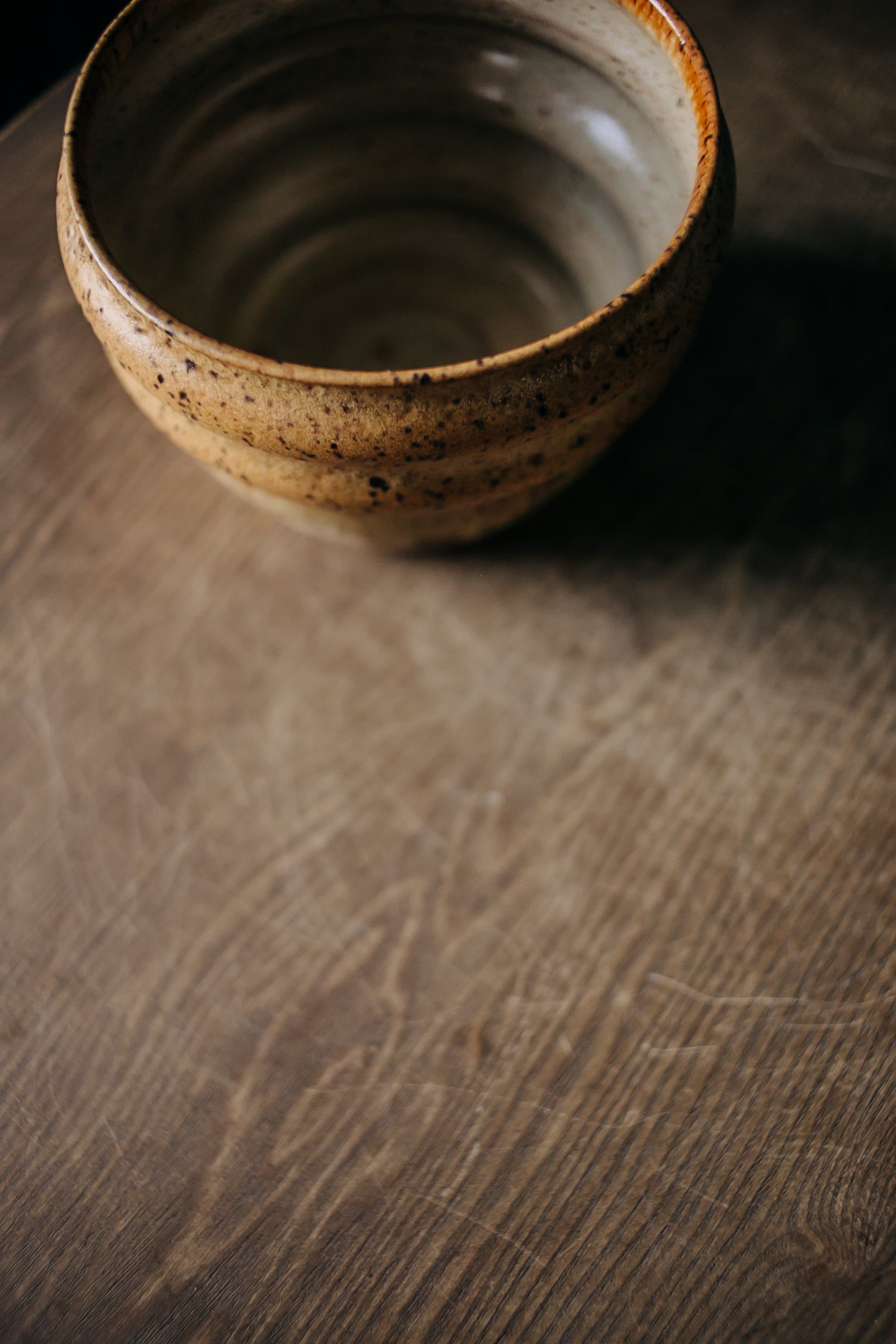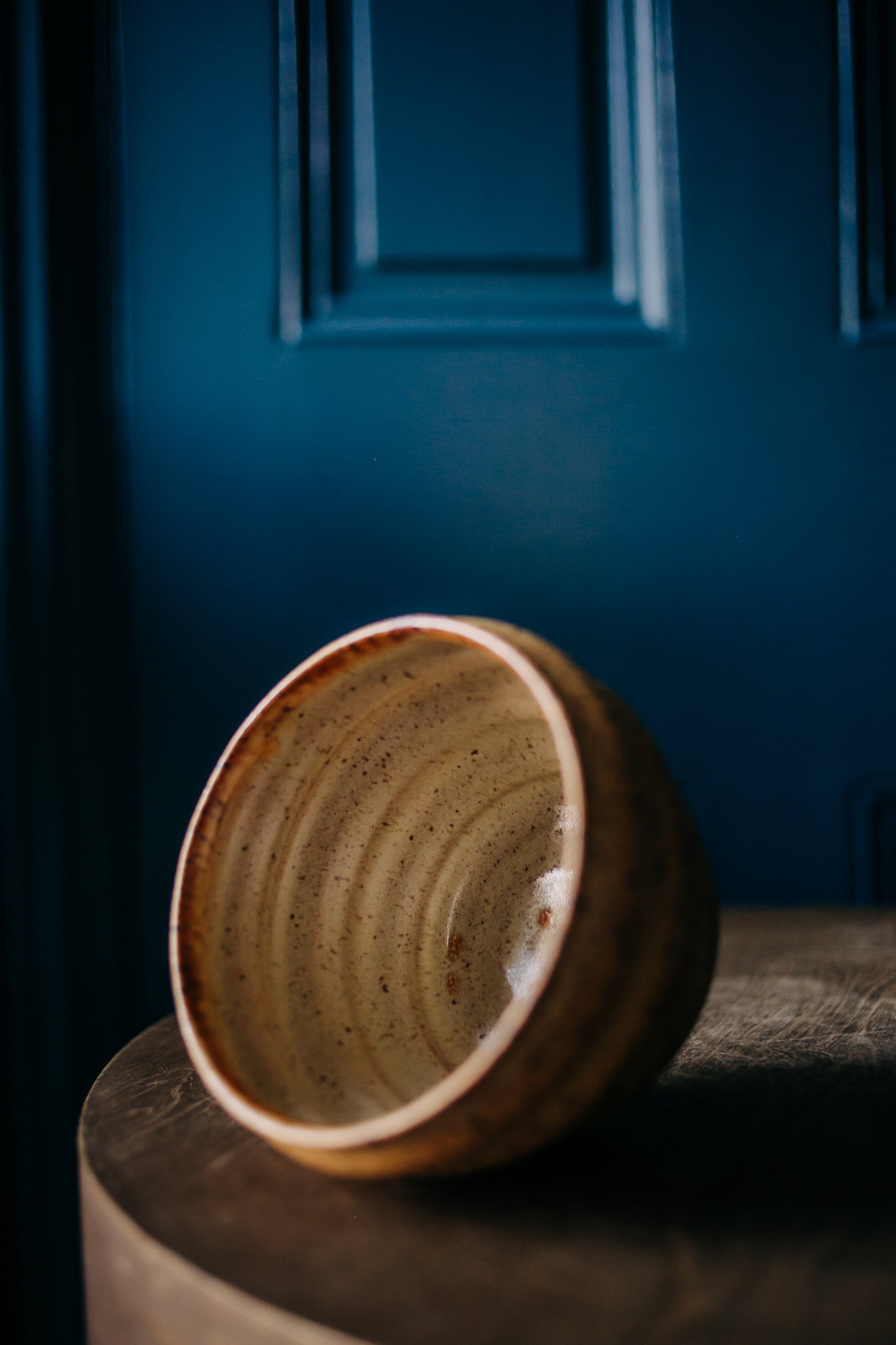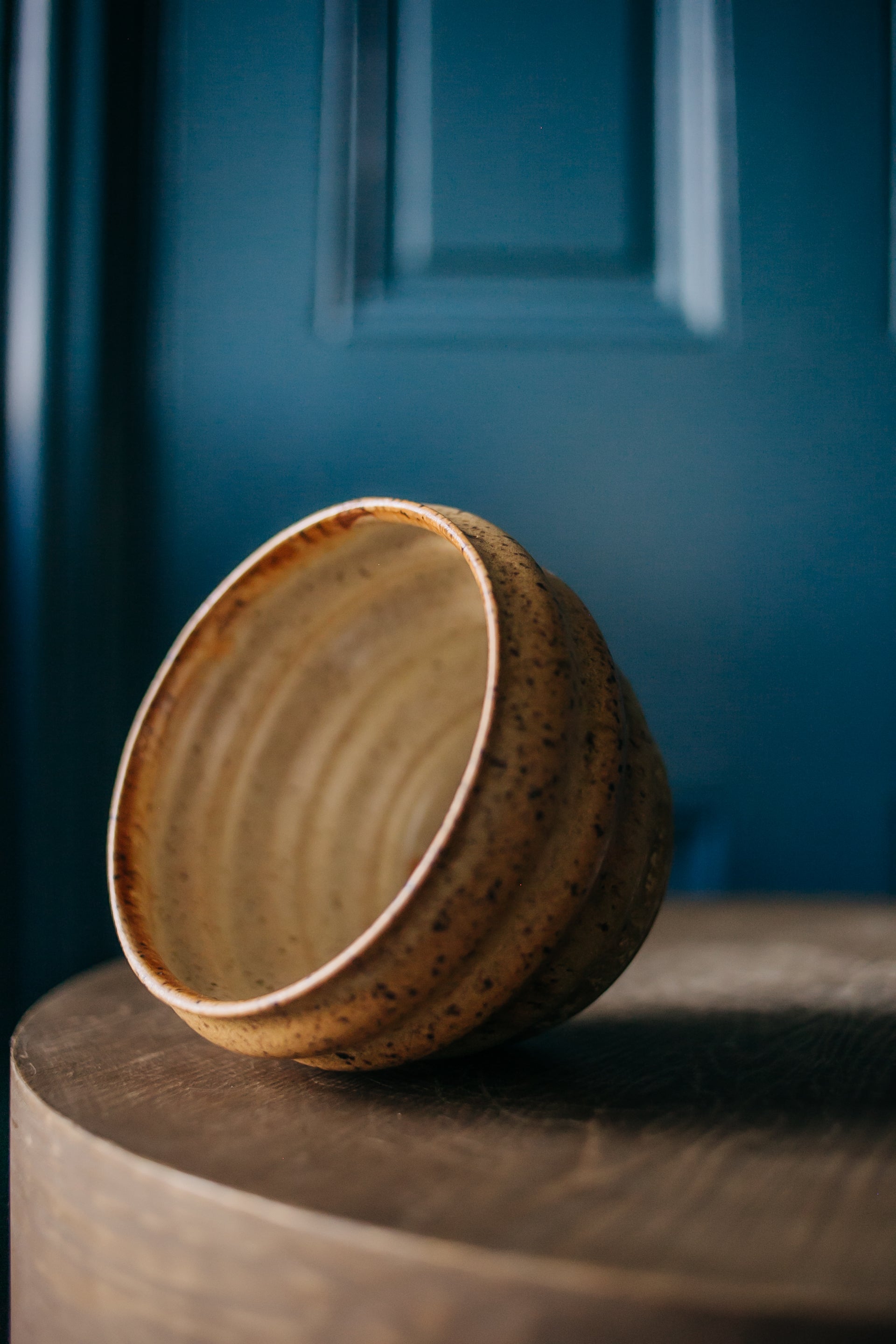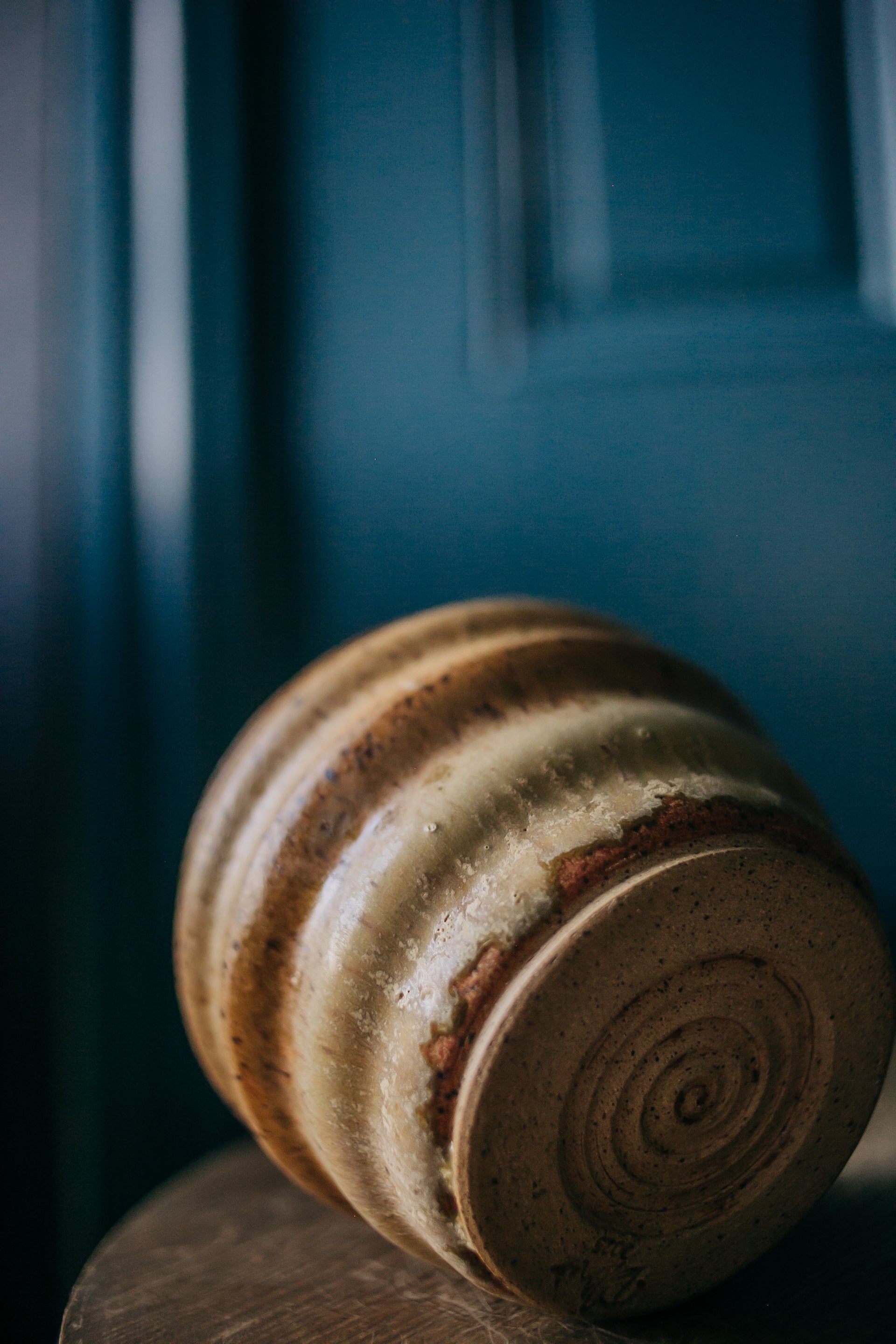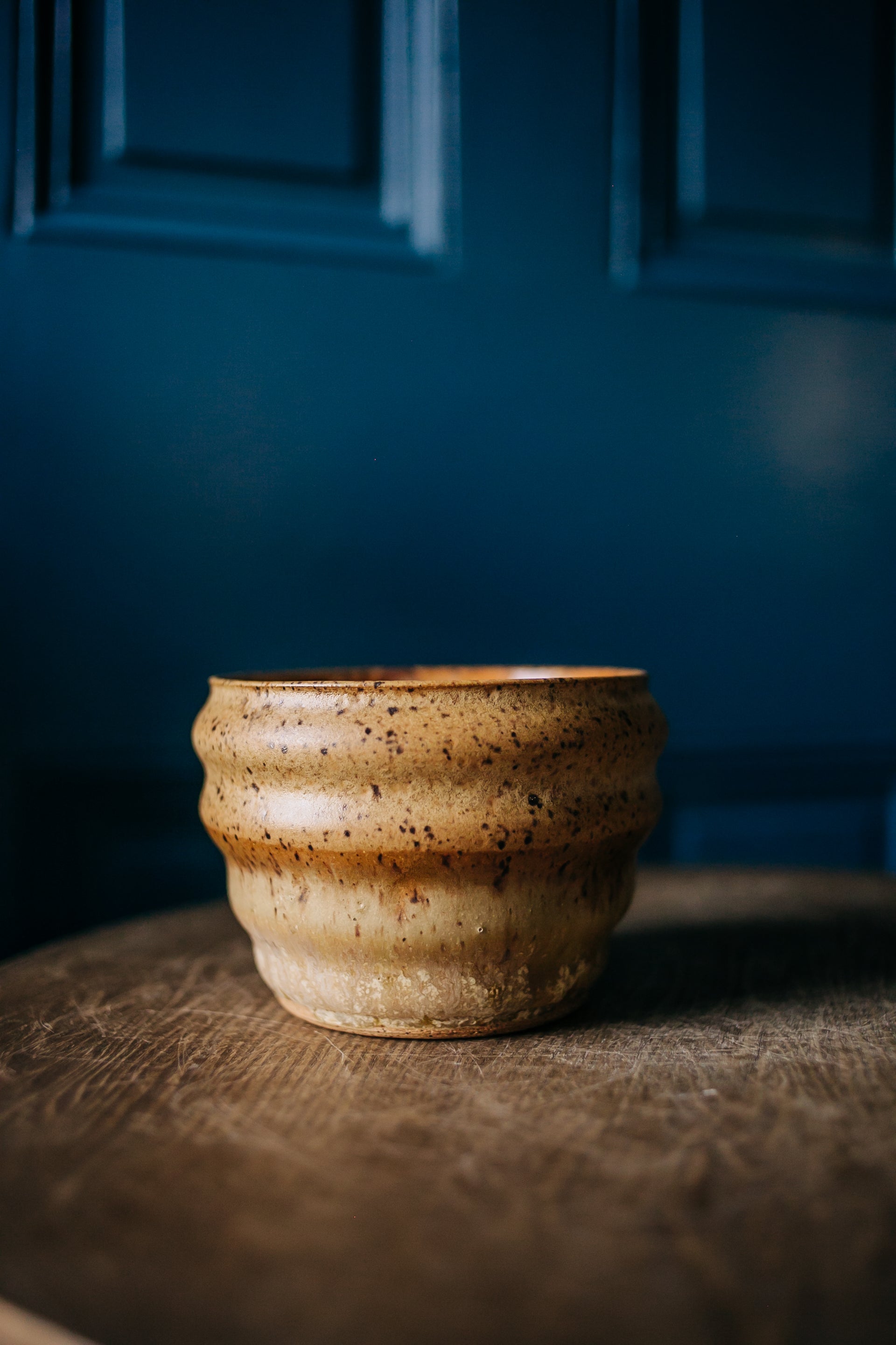 OK, so this guy is somewhat literally named. Even Ollie agreed this was the right name. The rippled surface is created with my fingers, so each one is a little different. The glazes are three different neutrals from the studio - Nutmeg on the inside, Golden Tan and Electric Ash outside. 5 1/2" around x 3 3/4" tall