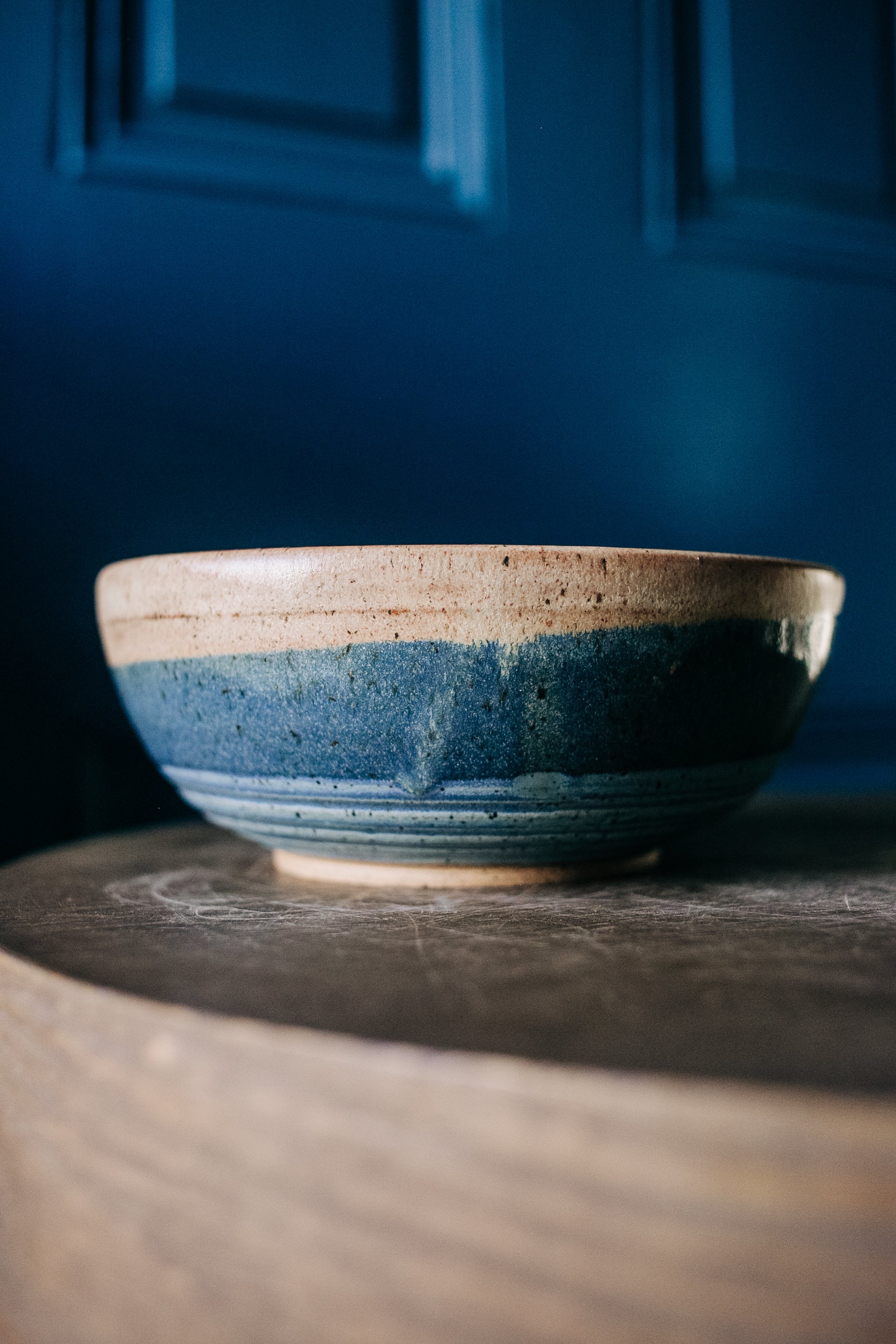 He's a sturdy fellow, like a good pair of khakis or jeans. Handsome colors, intriguing textures and super functional. 7 1/2" in diameter by 3" high