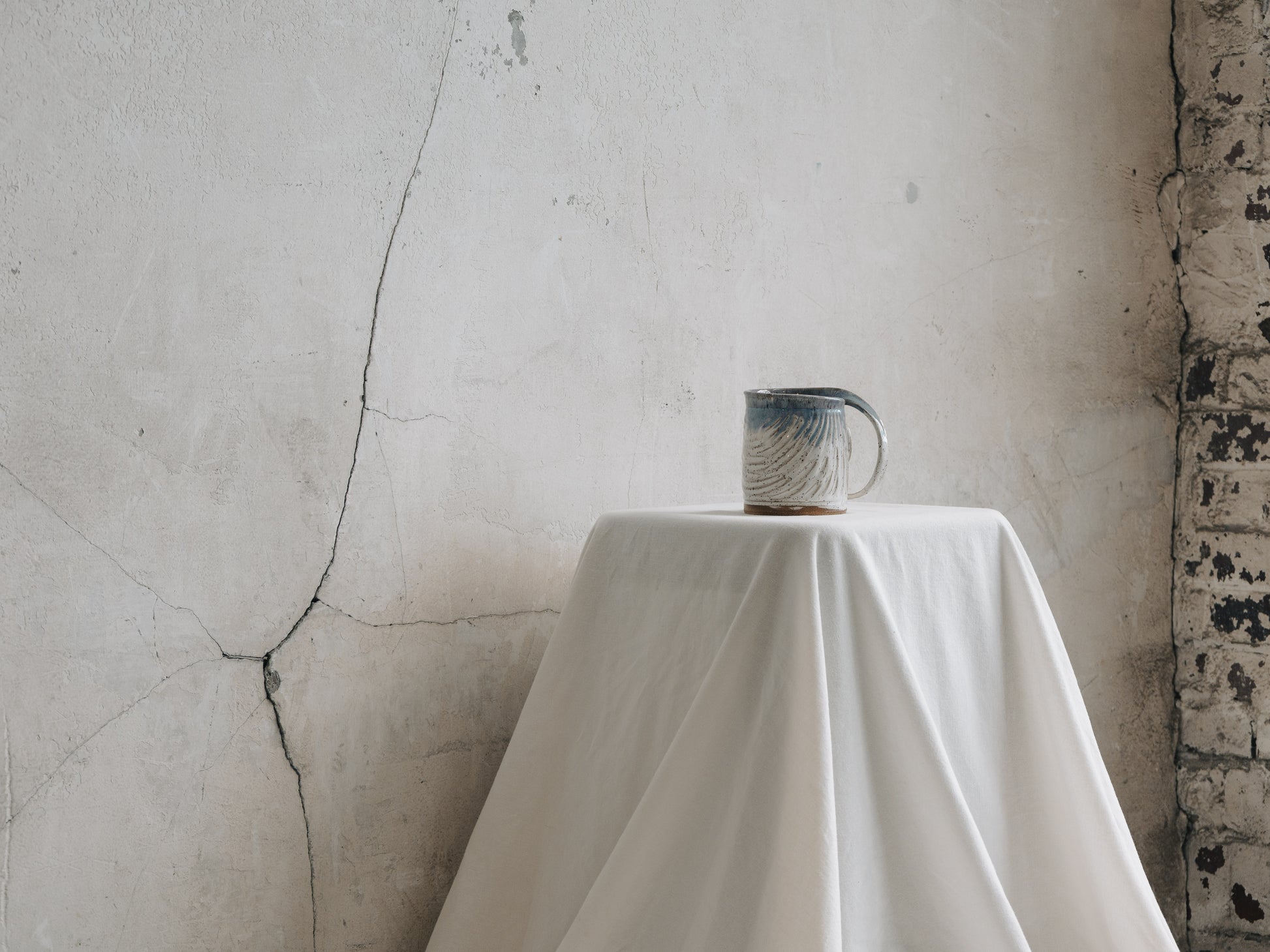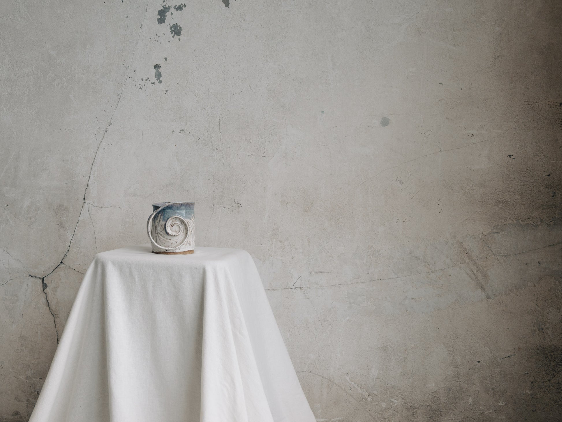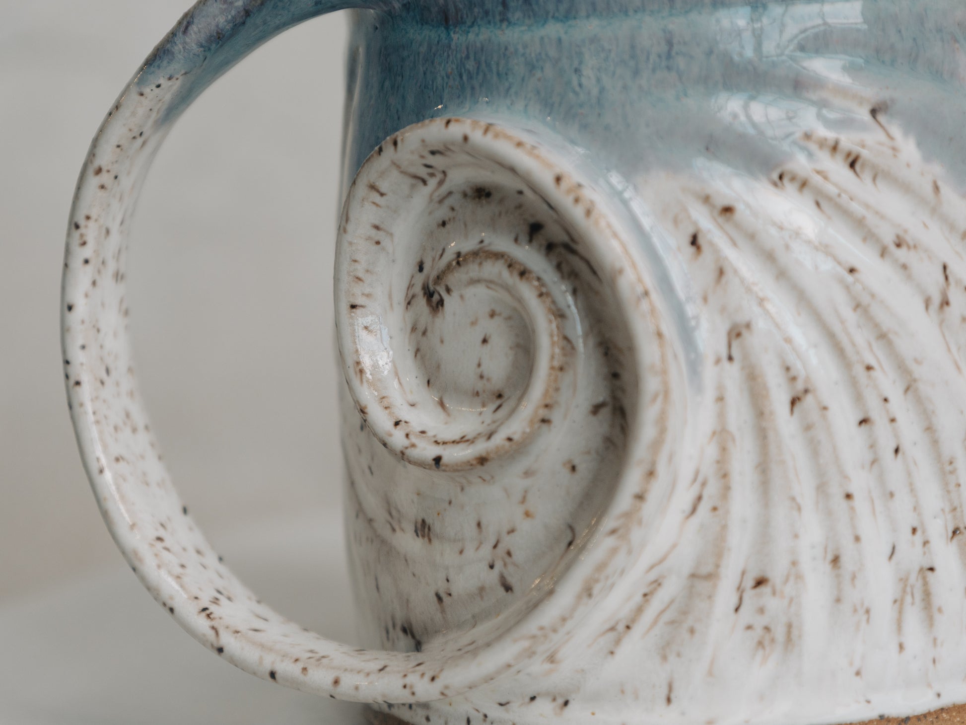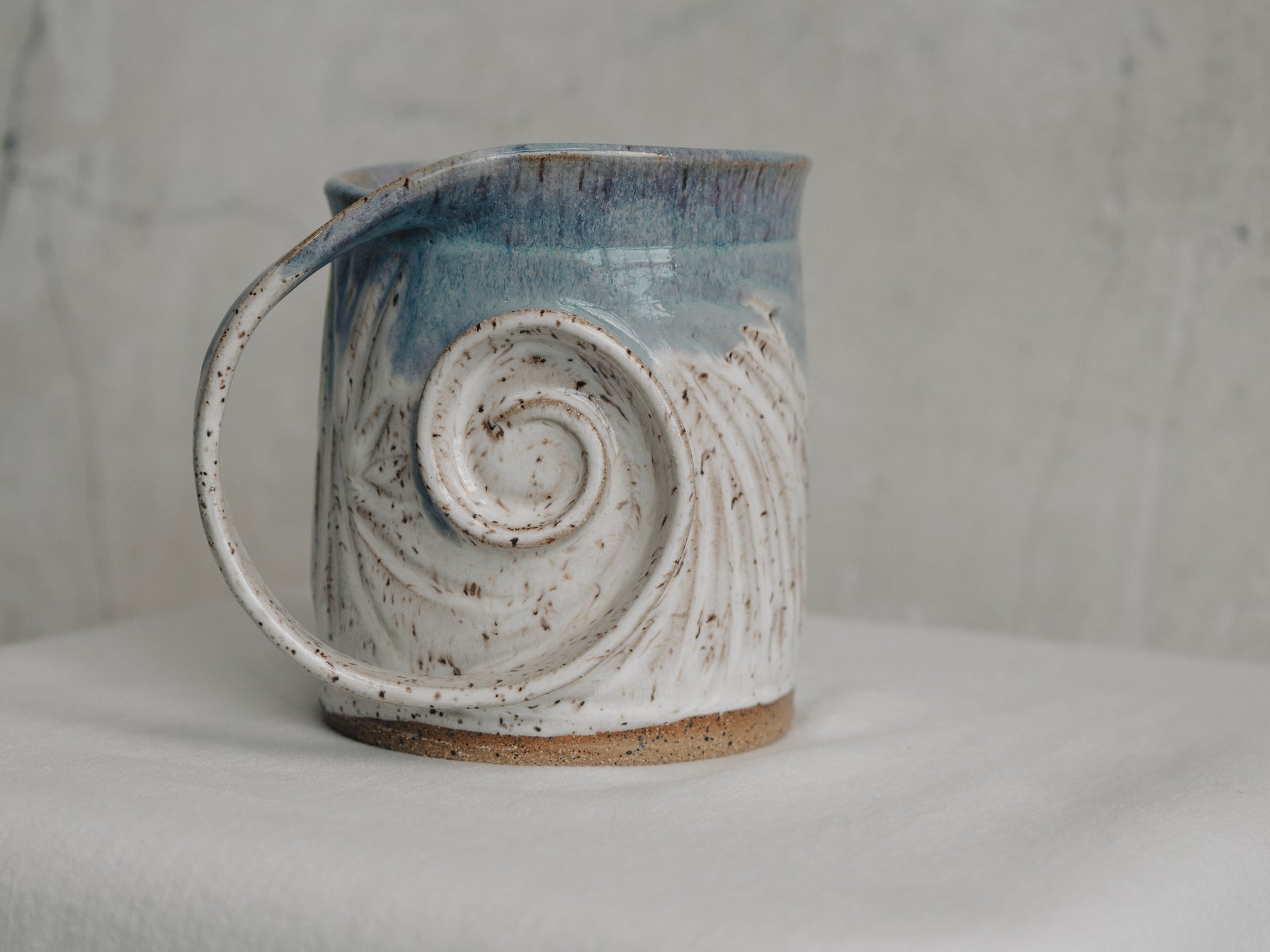 This lady is everything ethereal from the delicate carving across her body to the thin and elegant handle. A blend of cream and blue on the rim keep that light and airy feeling going. Holds 16oz. 5" tall x 5" around
