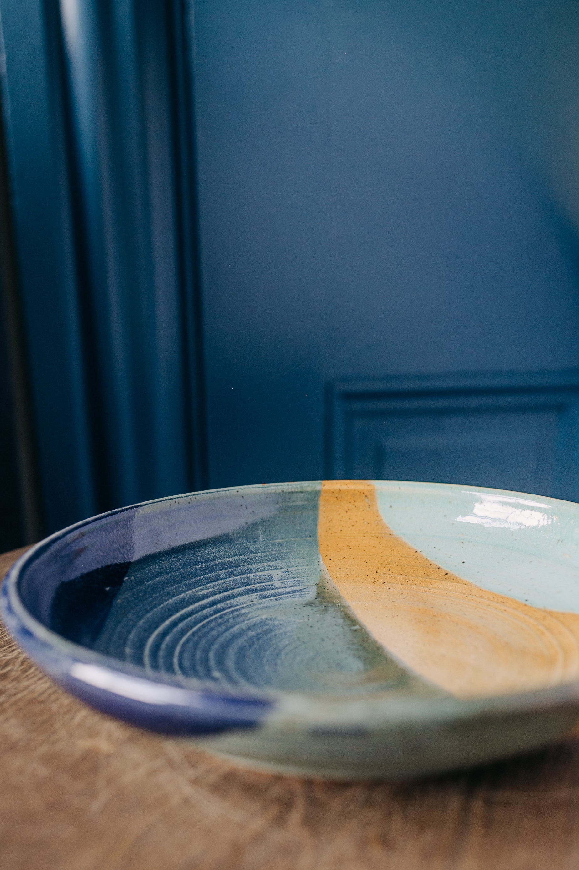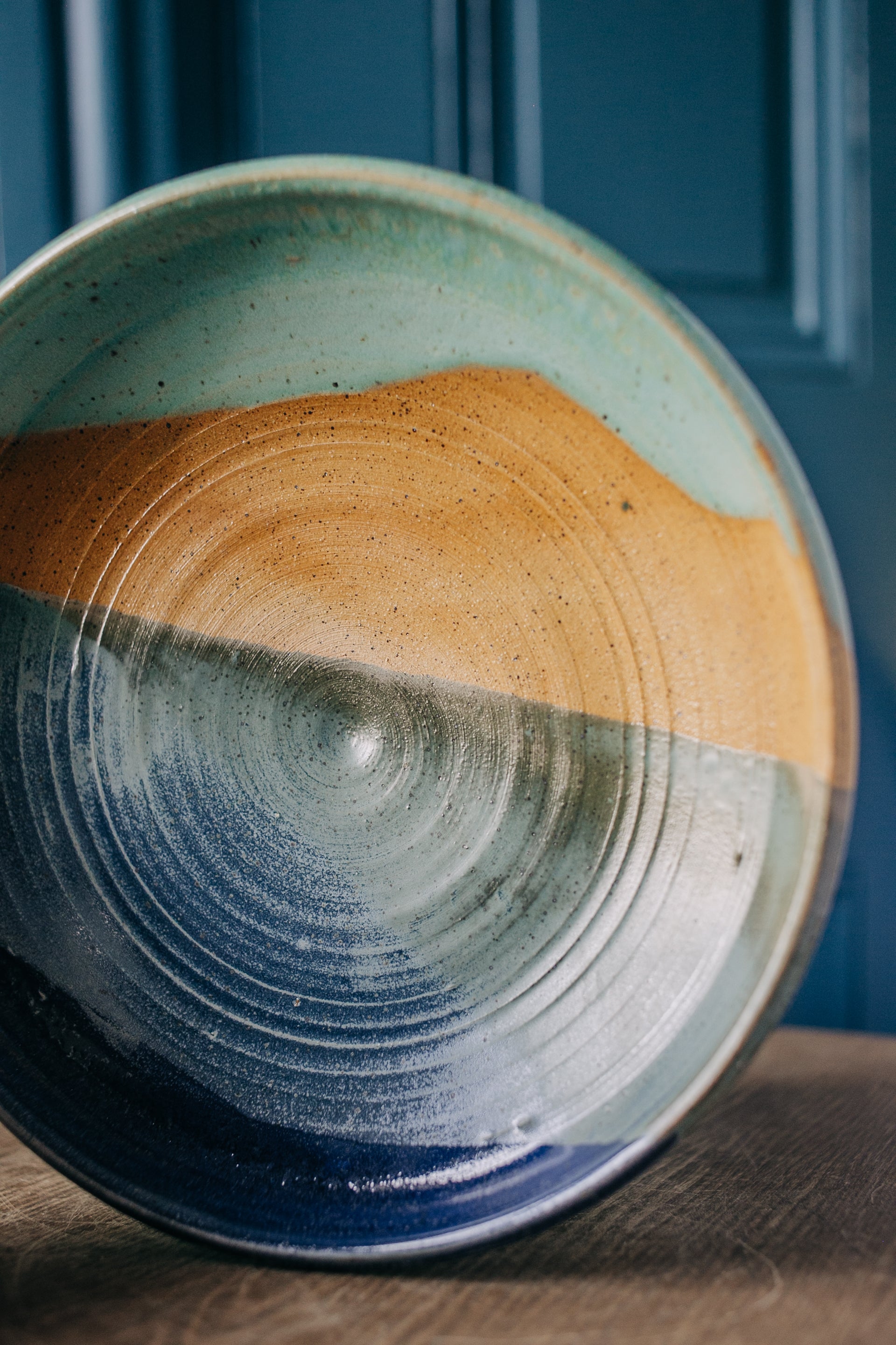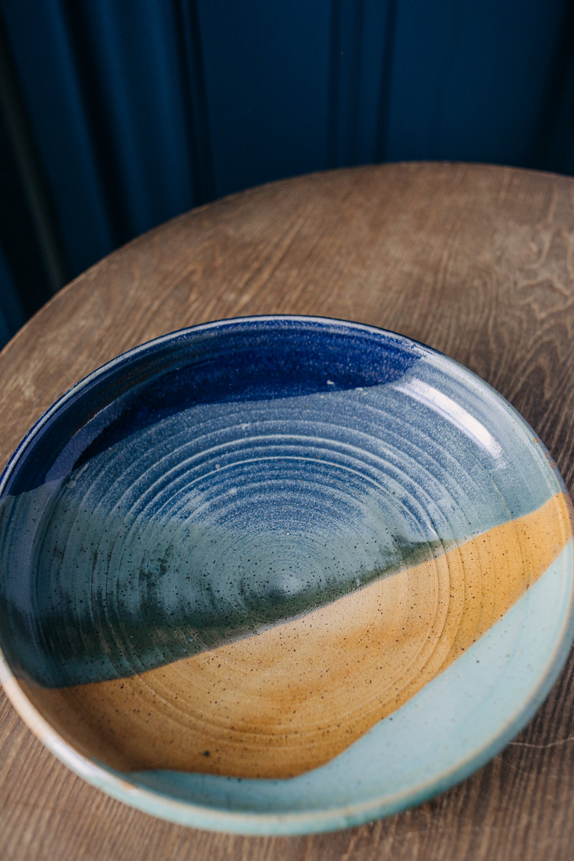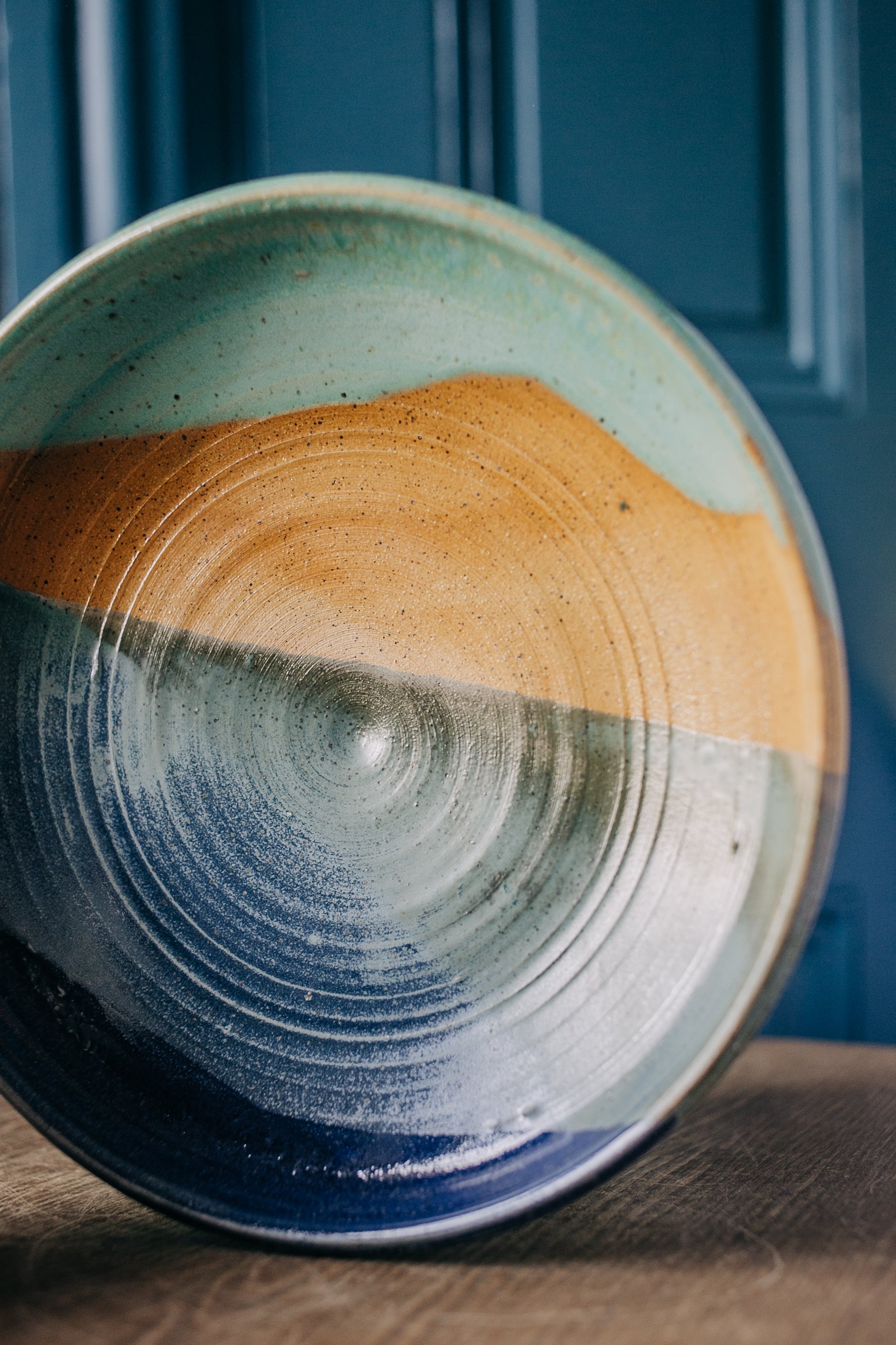 I wasn't going to sell this one because I just love how the glazing turned out. It's also one of the few "plate-like" things that I've created. Alas, here he is in all his glory - solid, handsome and reminiscent of a beachfront vacation. 9" in diameter x 2" high