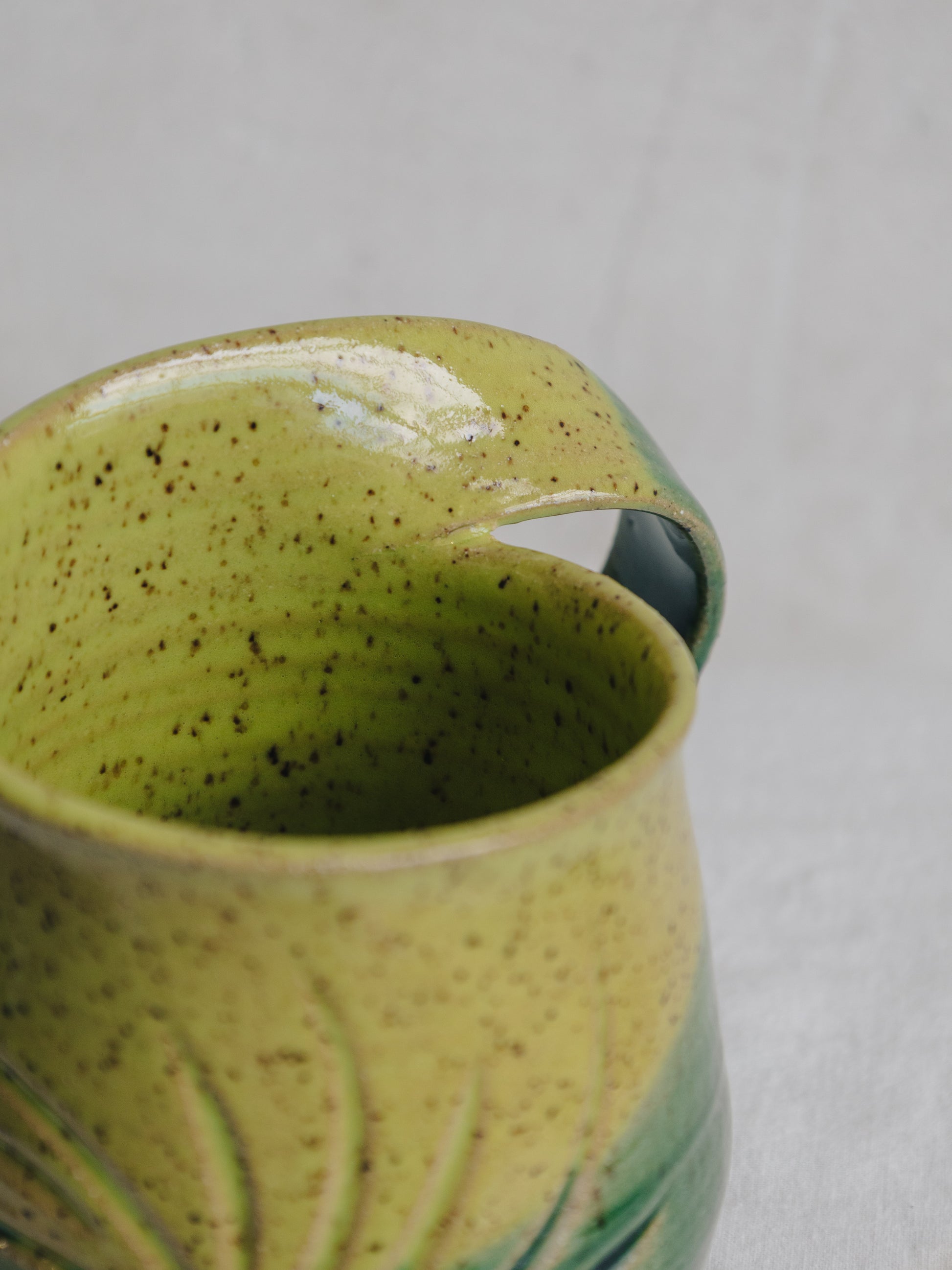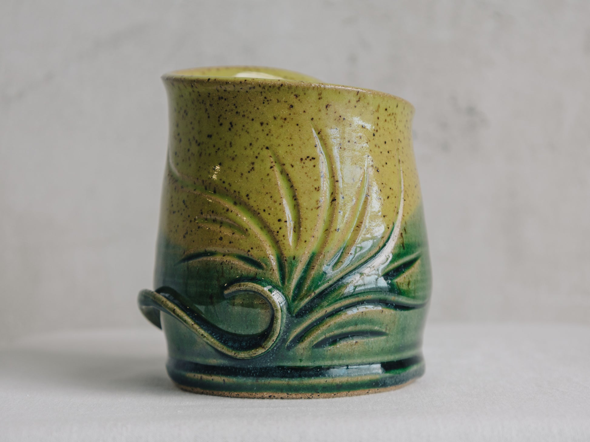This lady is not the bashful type, as elegant and beautiful as she may be! She is confident, holds a solid 16oz. of your favorite liquid and flaunts her curves, grooves and gorgeous green colors. 5" high by 5.5" around