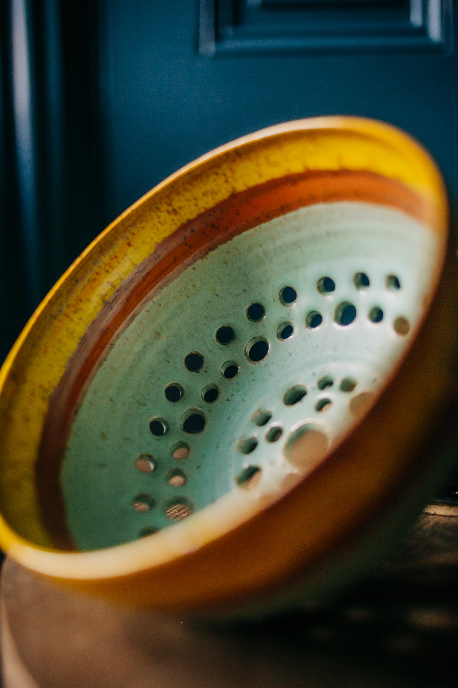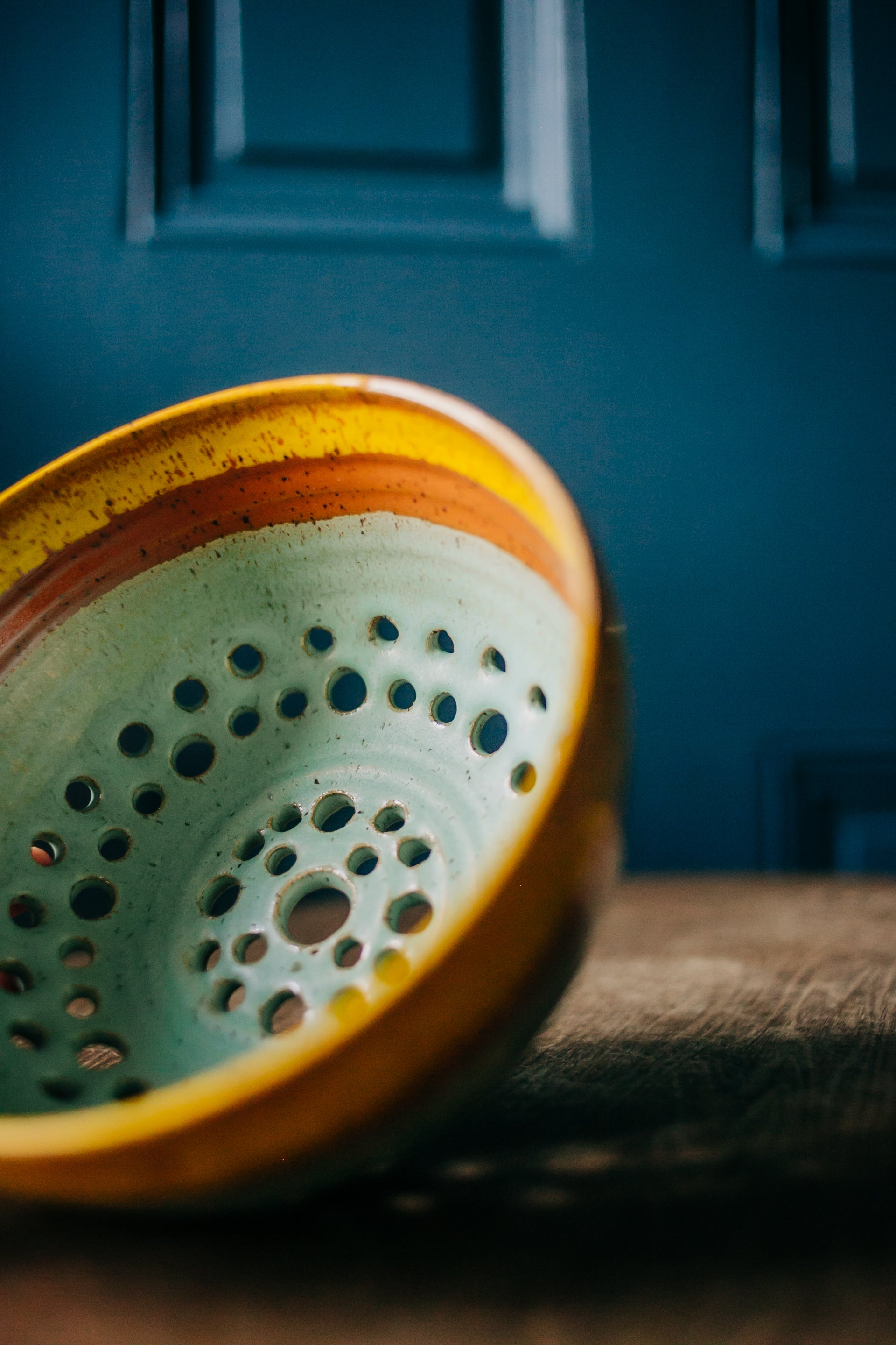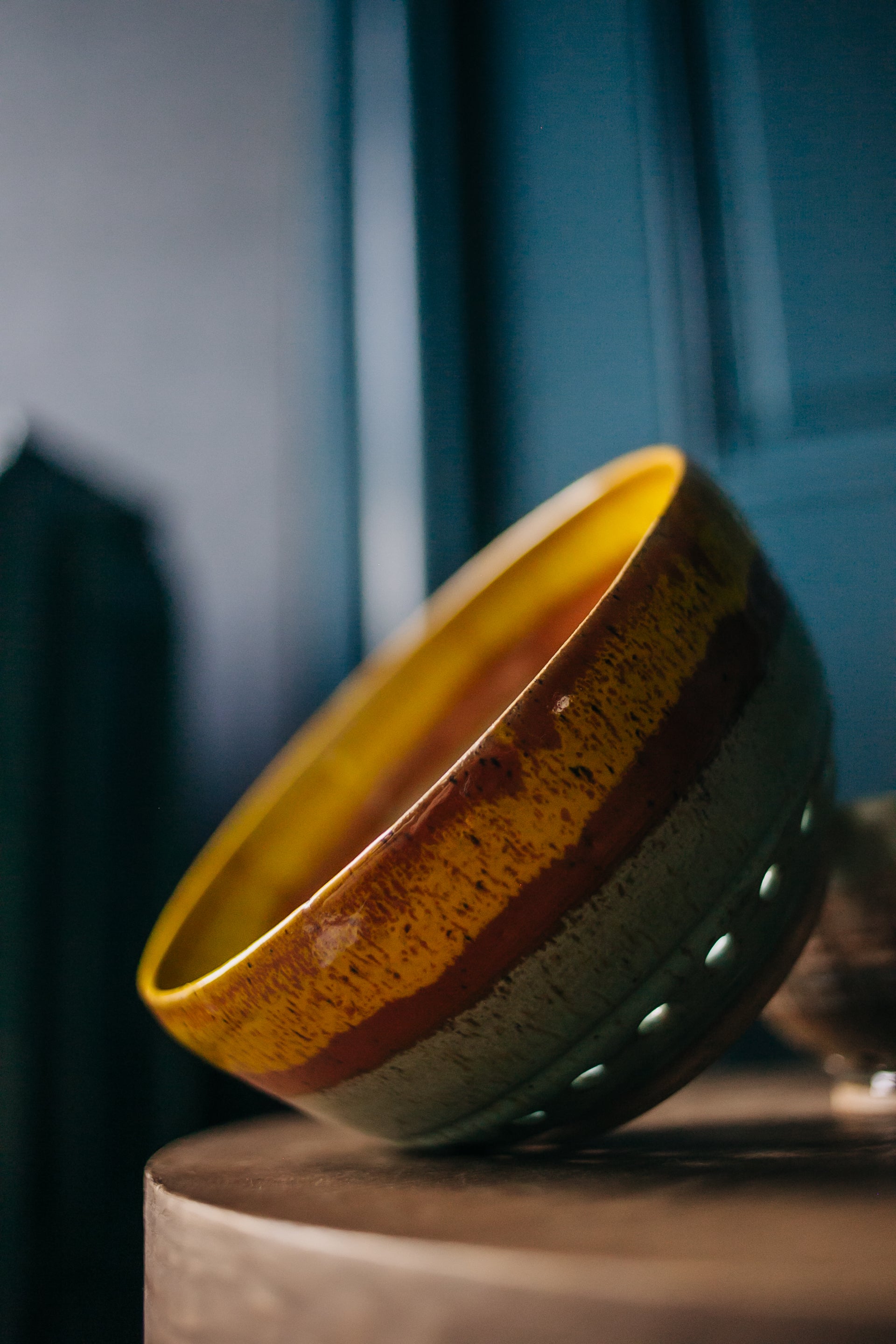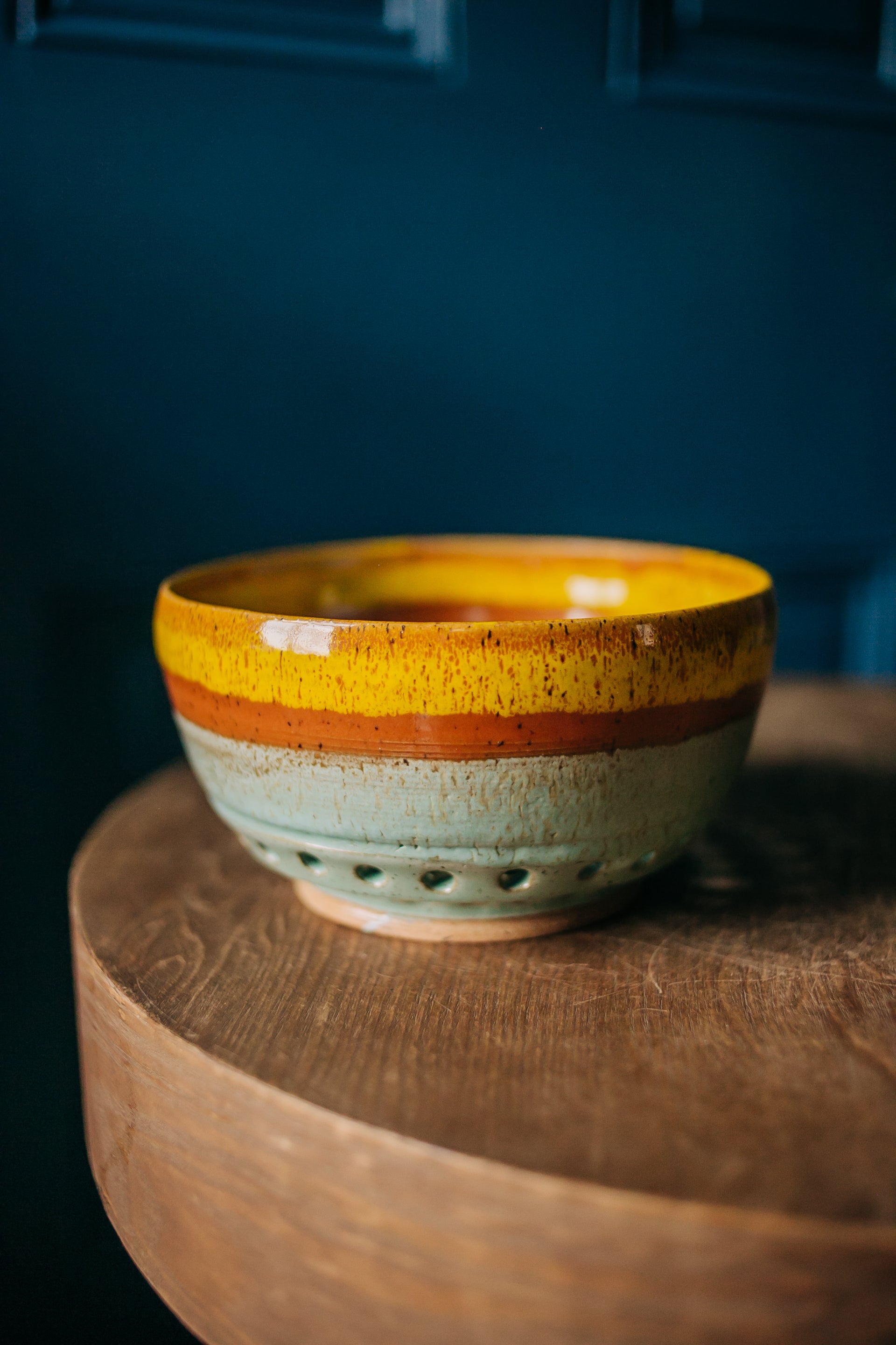 One of my largest berry bowls yet and also one of my favorites. Decided to get quite creative with the colors - I'm quite find of the yellow. 7" in diameter x 3 1/2" high
